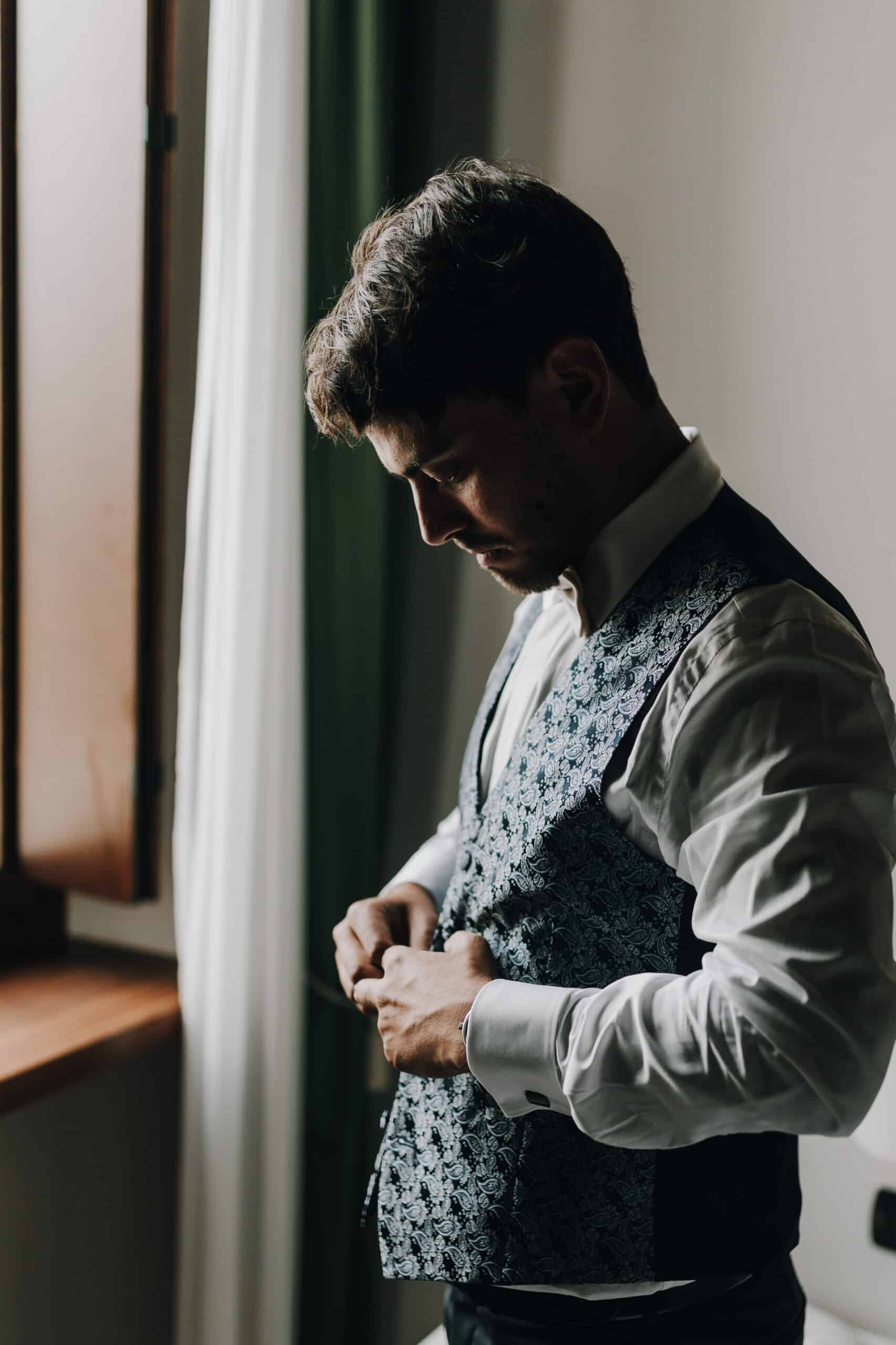020 – 02-07-23 HZ Theresa und Valentin – L Detailaufnahme eines Bräutigams beim Knöpfen seines Hochzeitsanzugs, natürliche Beleuchtung.