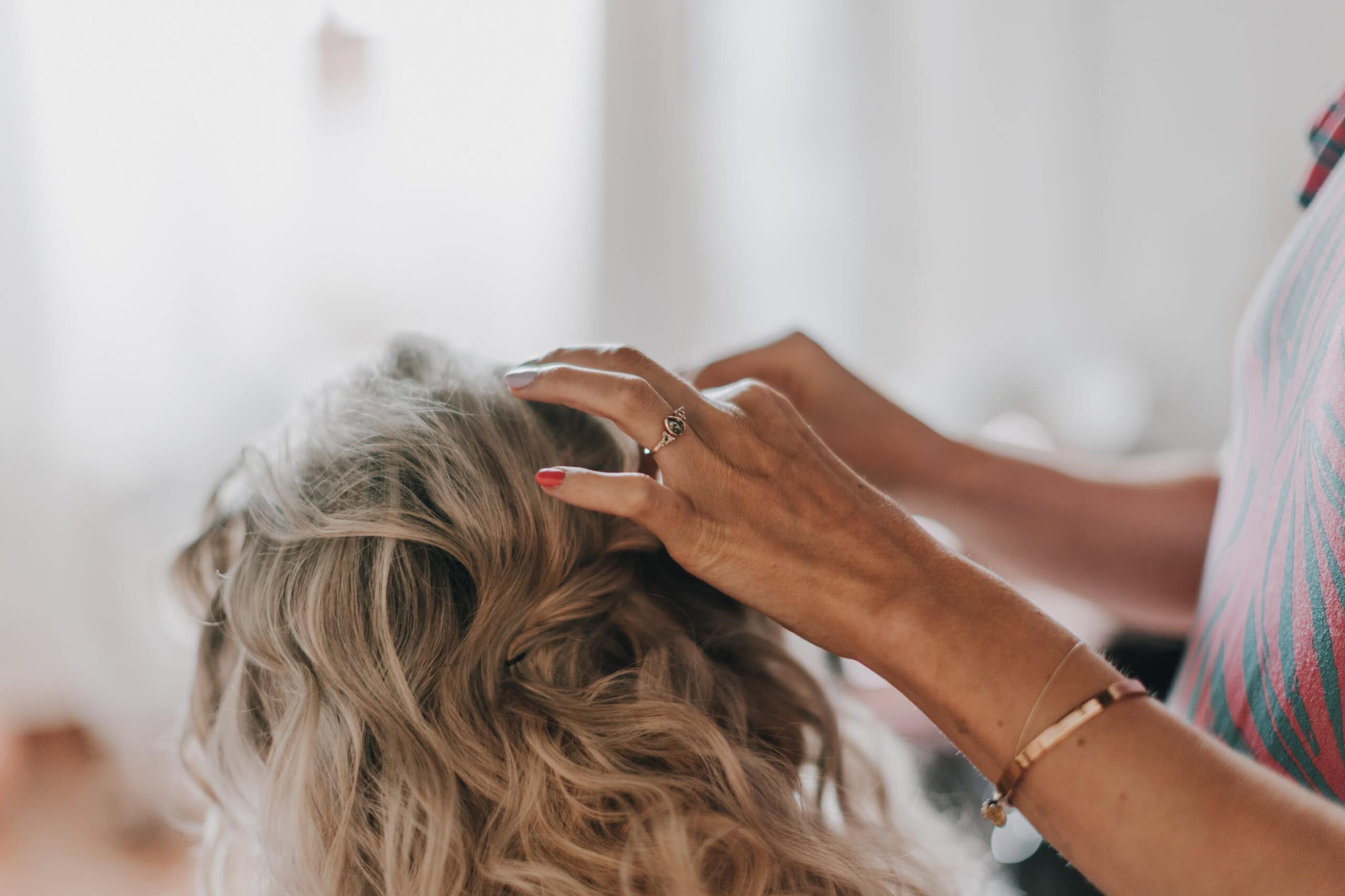 Detailaufnahme einer Person, die am Haar einer Braut arbeitet, bei der Hochzeitsvorbereitung in Tirol.