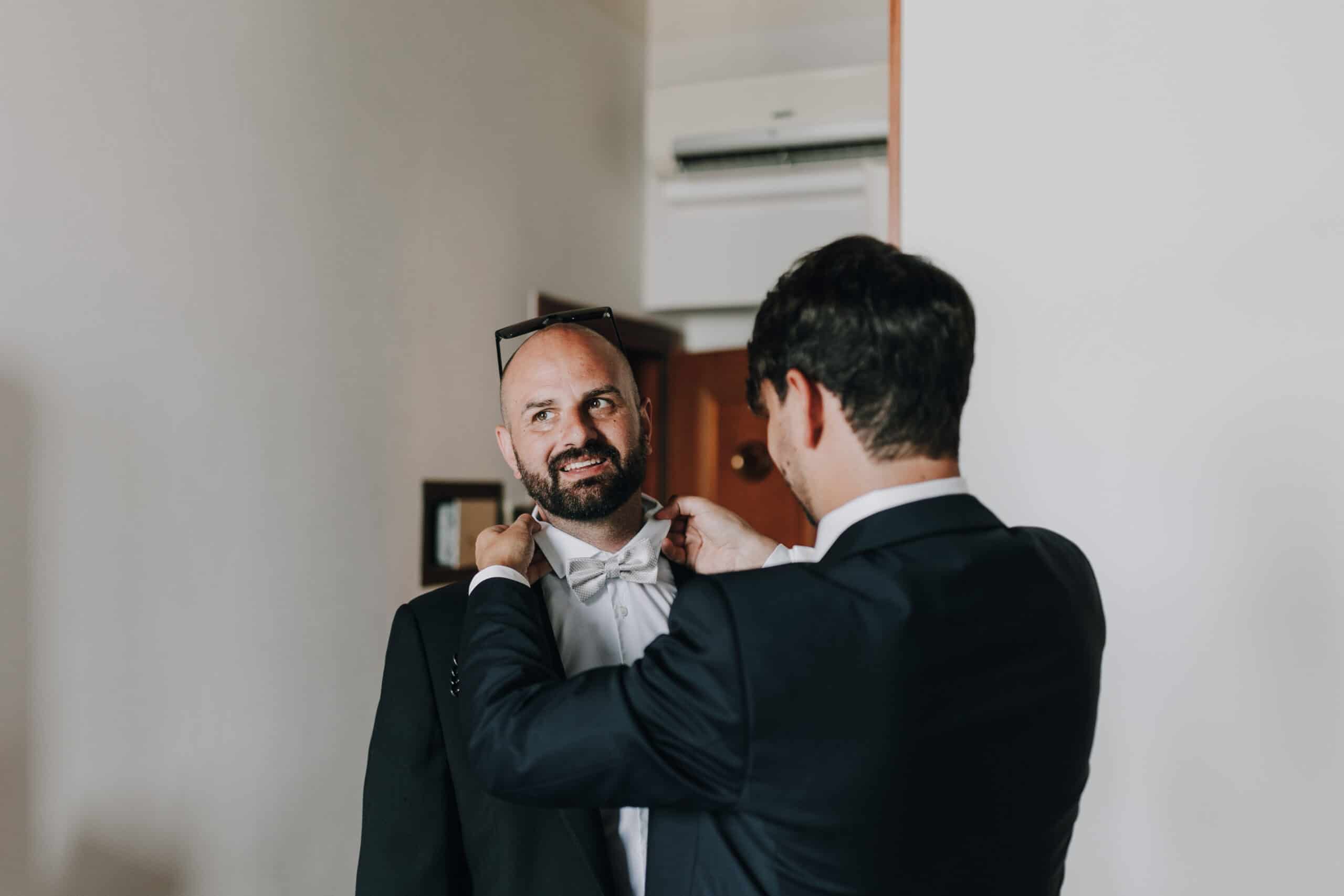 040 – 02-07-23 HZ Theresa und Valentin – L Bild zeigt einen Mann beim Ankleiden des Bräutigams an seinem Hochzeitstag, temporeich und emotional.