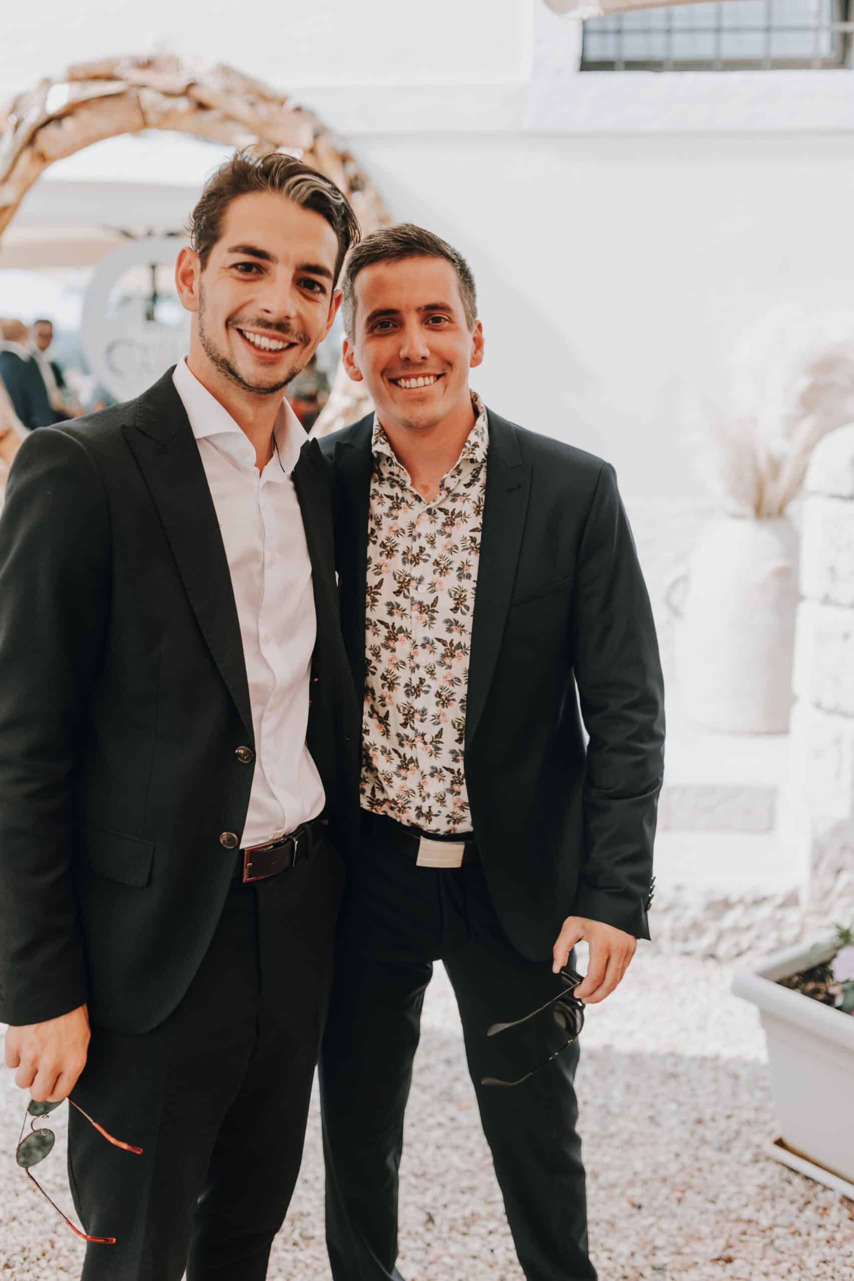 202 – 02-07-23 HZ Theresa und Valentin – L Zwei Männer in Anzügen bei einer Hochzeit, lachend und fröhlich, in Tirol, Österreich.