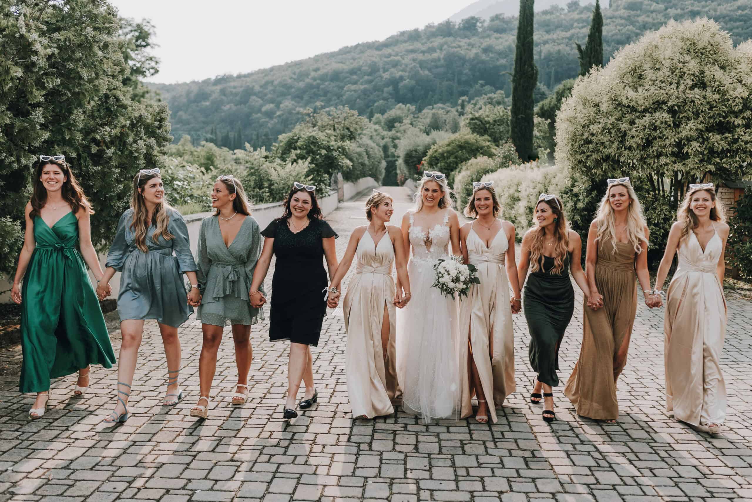 Detailreiche Hochzeitsaufnahme mit Braut und Freundinnen in eleganter Kleidung, umgeben von grüner Natur in Tirol, Österreich.