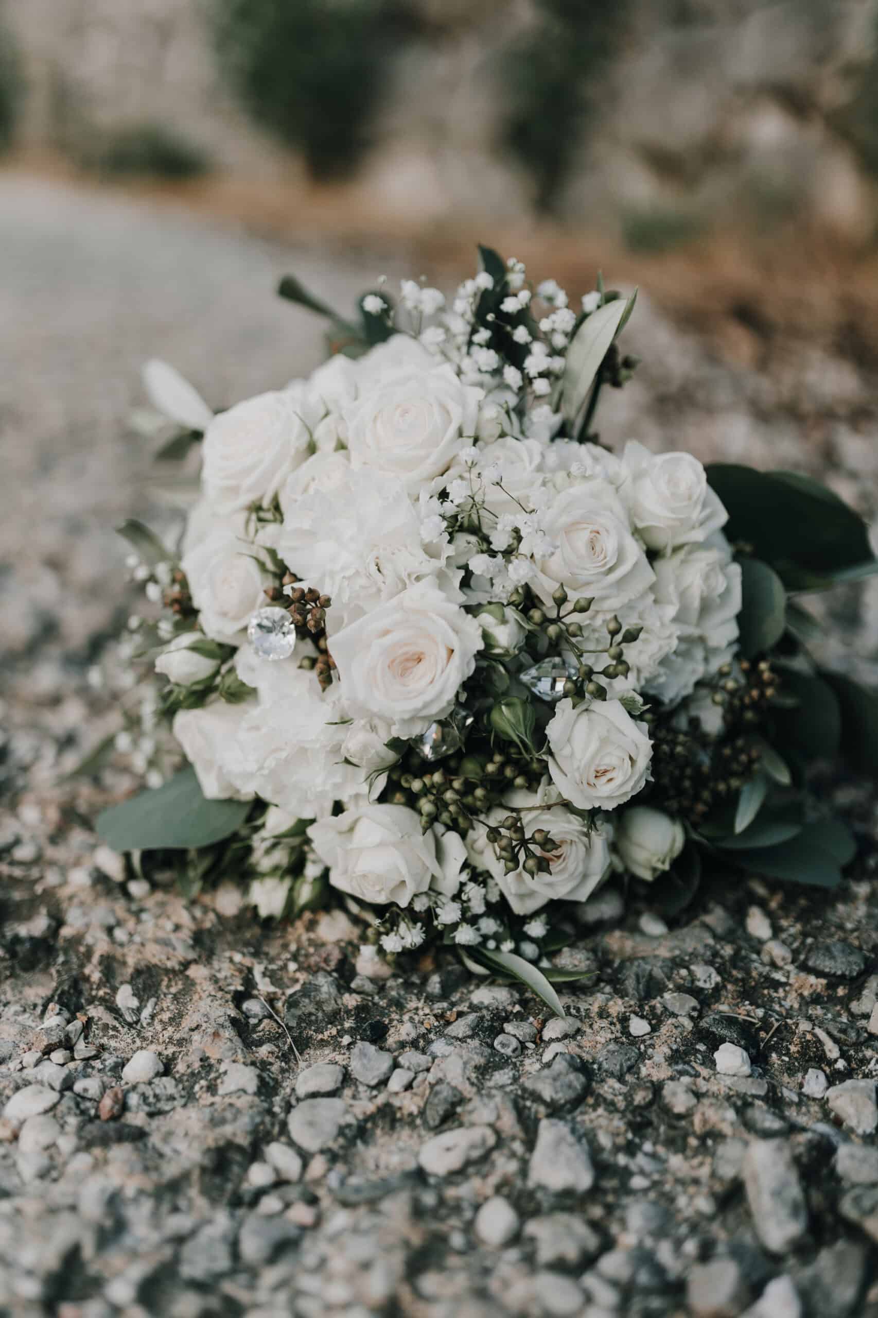 365 – 02-07-23 HZ Theresa und Valentin – L Beschreibung eines eleganten Brautstraußes mit weißen Rosen, kleinen Blüten und grünen Blättern auf einem Kiesweg, perfekt für Hochzeiten in Tirol, Österreich und international.