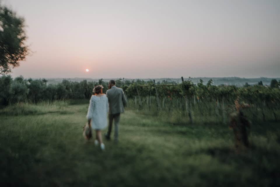 572 – 06-10-23 HZ Sophie und Stefan – L Ein verliebtes Brautpaar geht Hand in Hand durch eine Weingarten-Landschaft in Tirol bei Sonnenuntergang, aufgenommen von professionellen Hochzeitsfotografen.