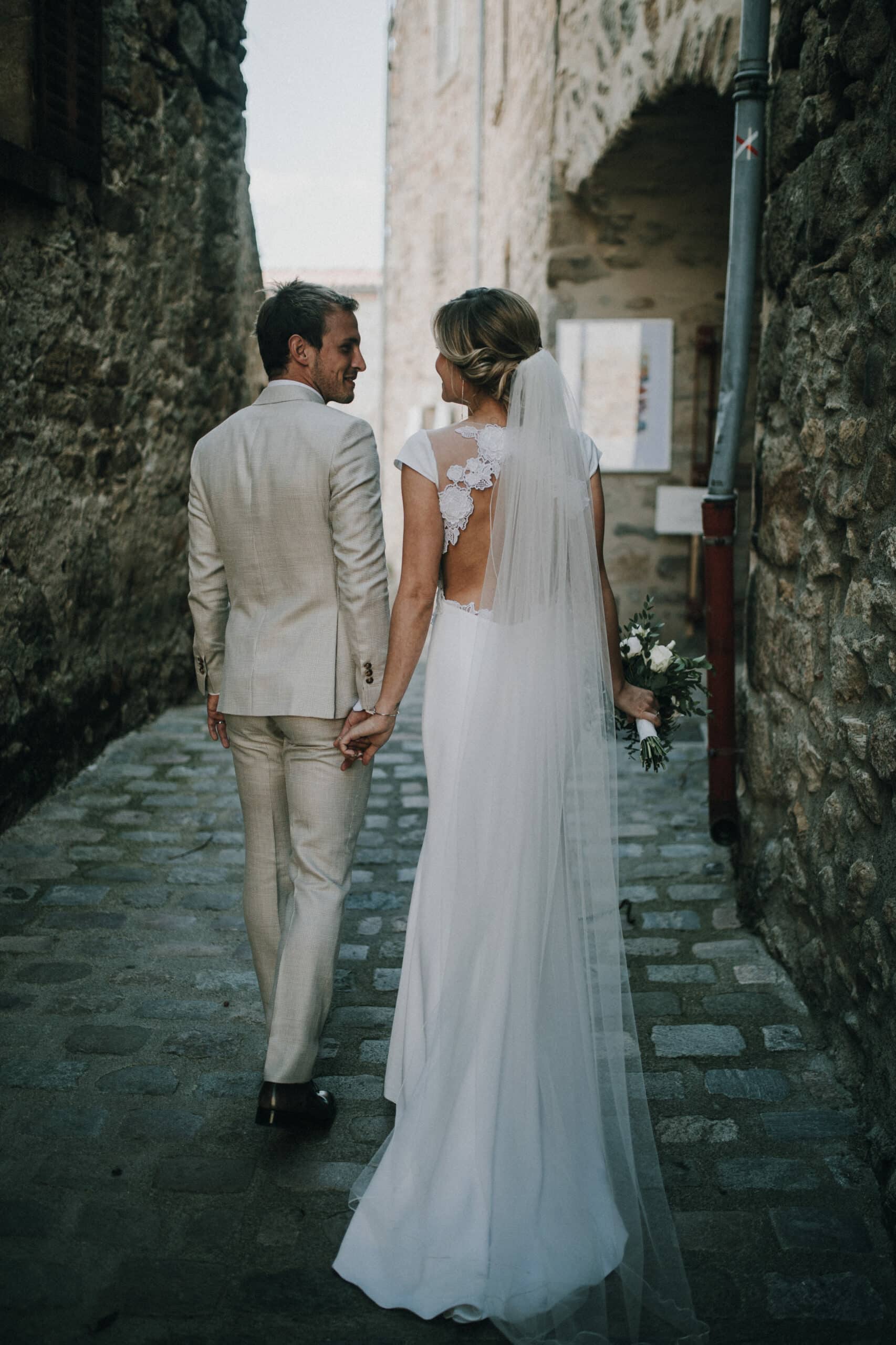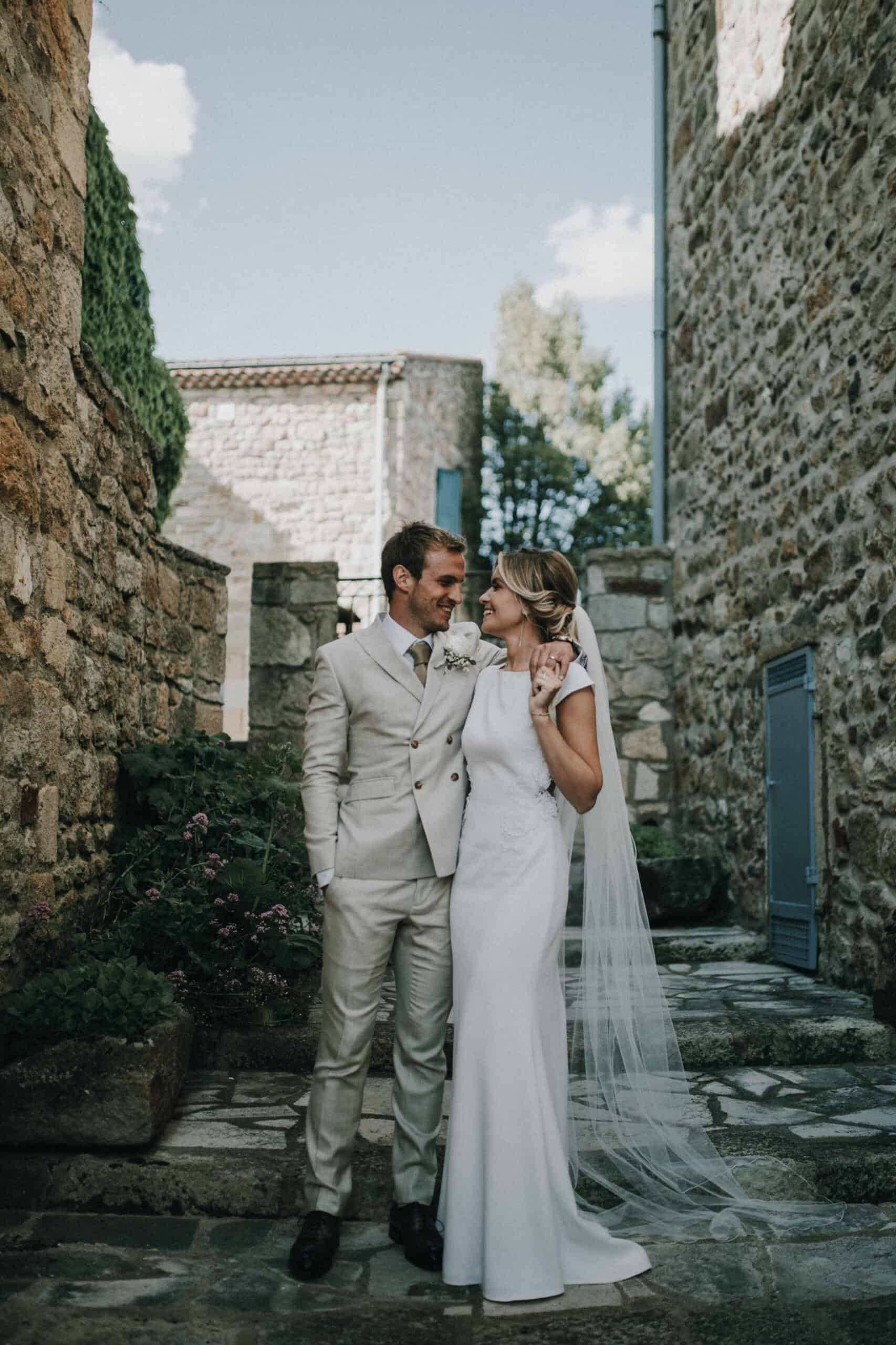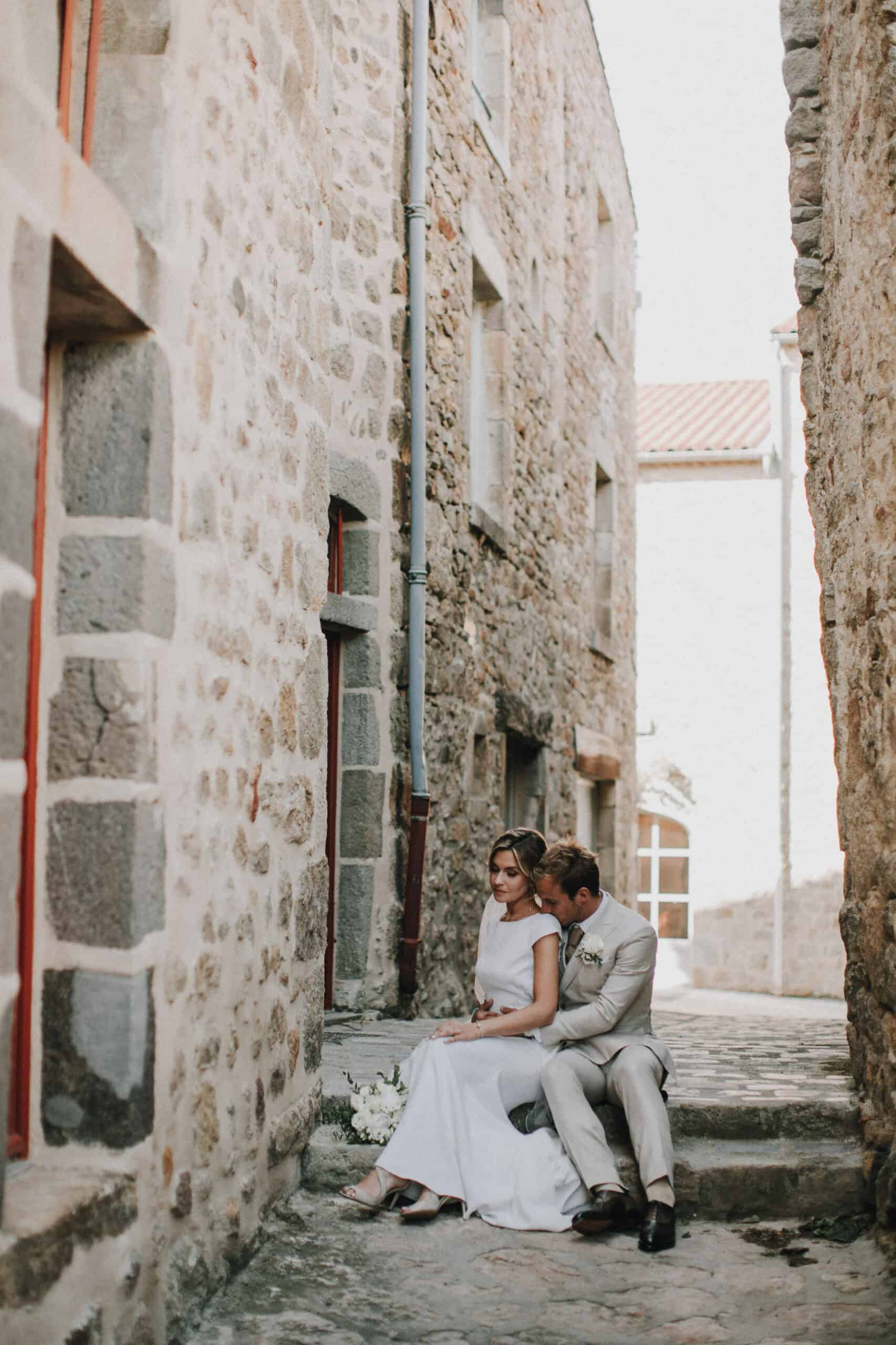 Romantisches Hochzeitsfoto eines Paares in einer alten Gasse mit Steinmauern.
