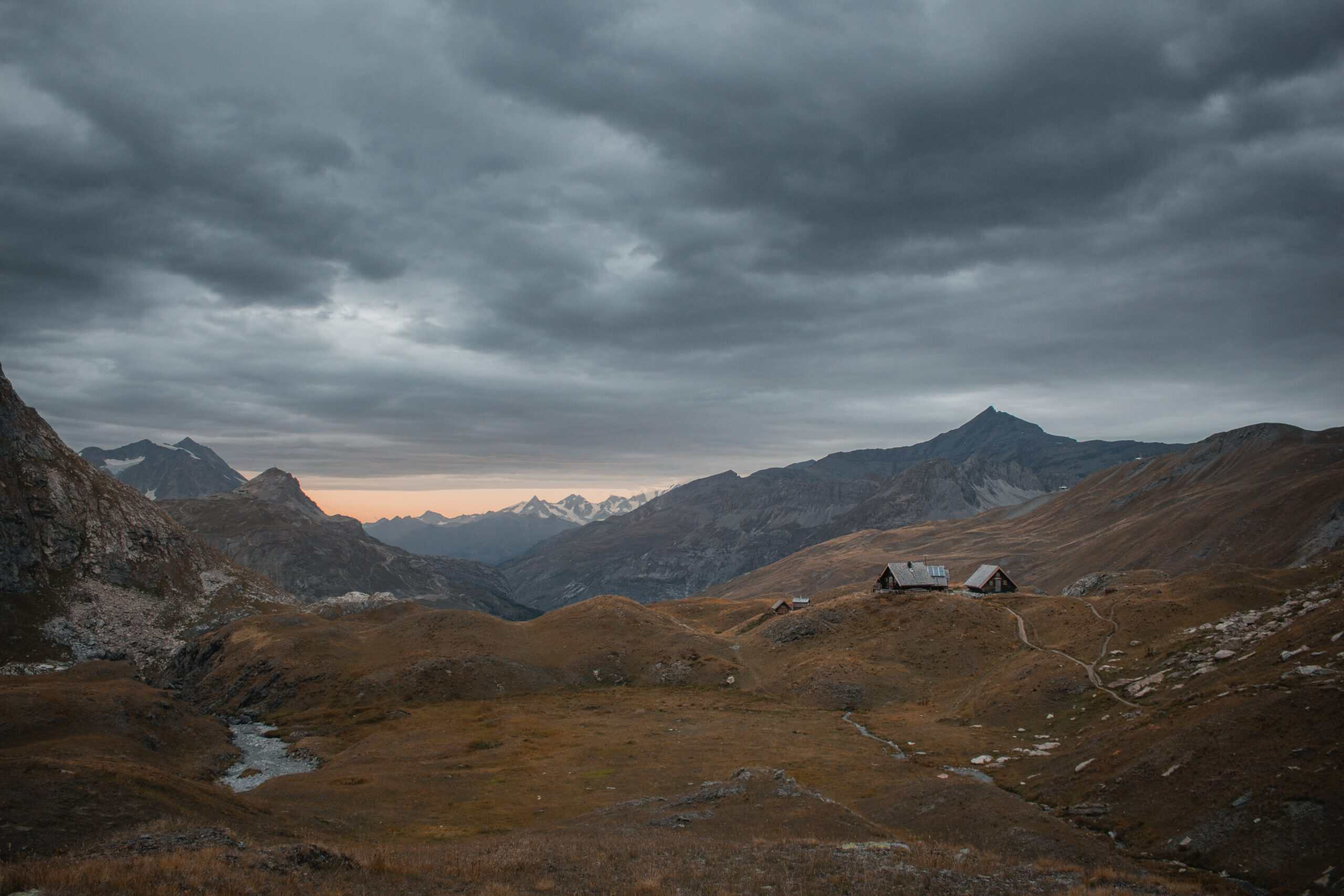 Dunkle Regenwolken über den Alpen, mit einsamen Berghütten und einer Berglandschaft bei Sonnenuntergang in Tirol.