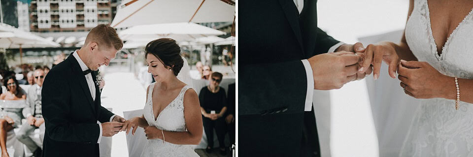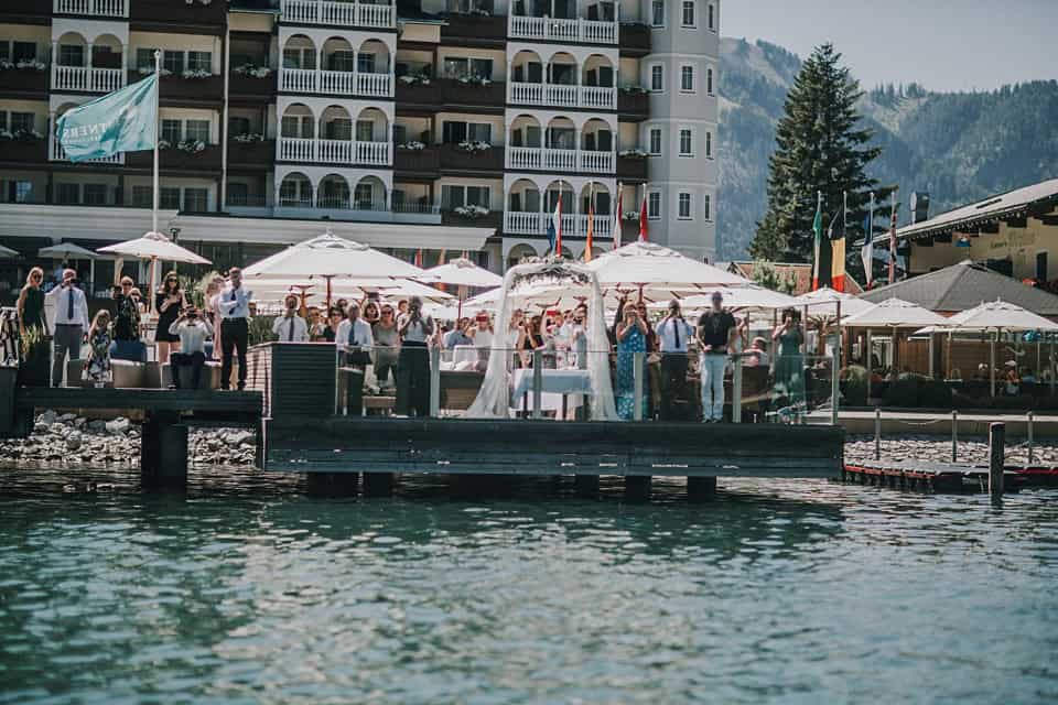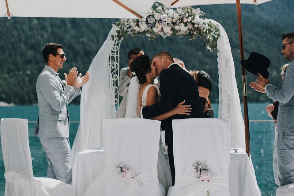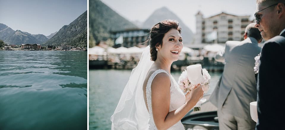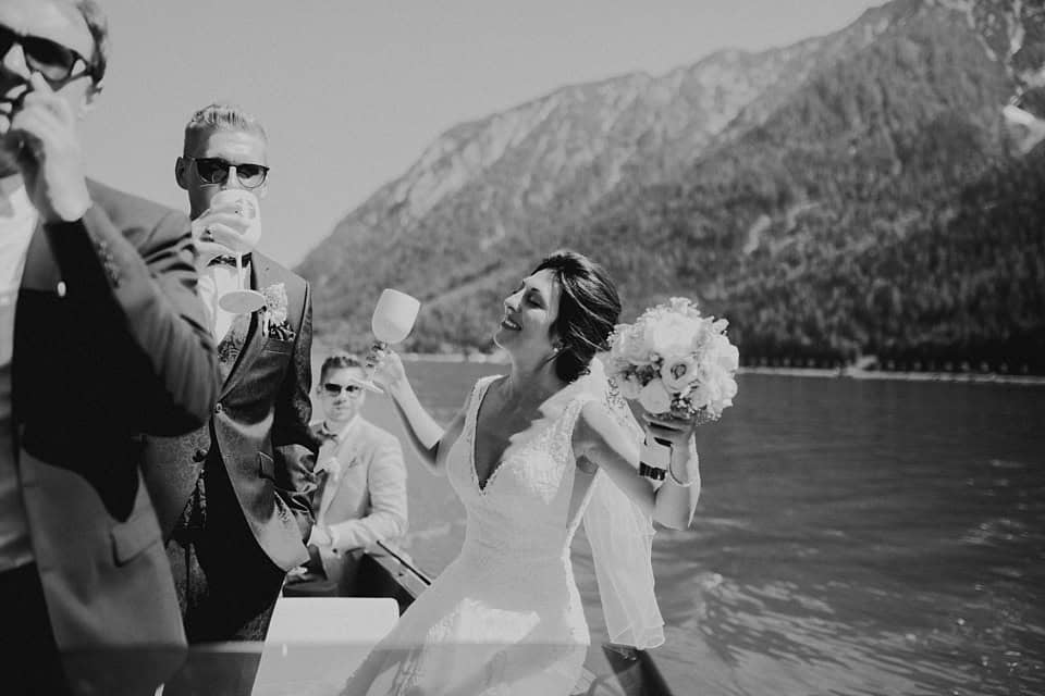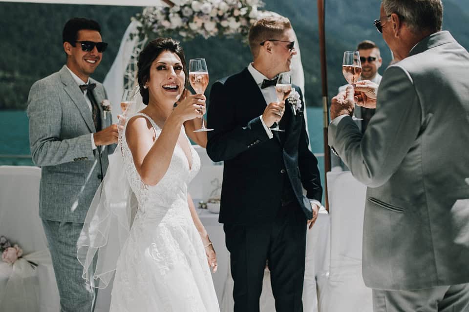 Im Anschluss an die kirchliche Trauung ging es für die beiden mit einem kleinen Motorboot wieder zurück zum Strandhotel Entners. Dort wurden die beiden von Familien und Freunden bereits erwartet. Bei herrlichem Sommerwetter stießen das Brautpaar mit Freunden und Familie auf ihren Tag, die Hochzeit am Achensee, an.