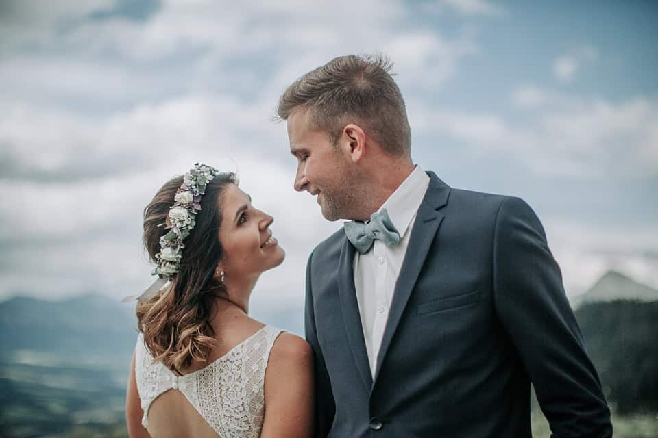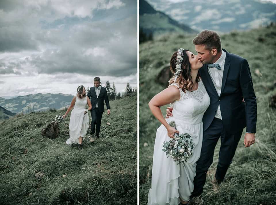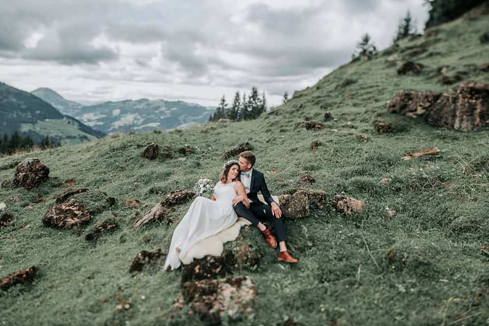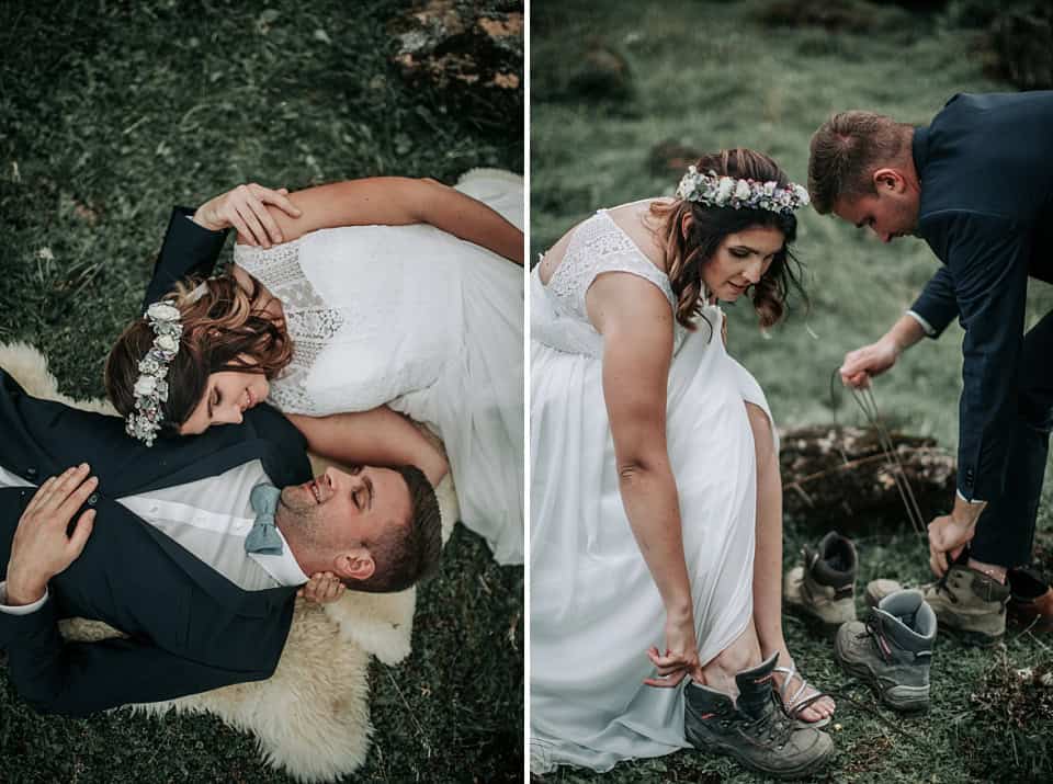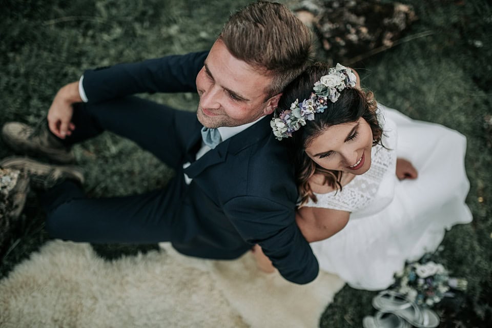 Nach der Trauung ging es für das Brautpaar Shooting hoch hinaus. Auf einem Plateau in der nähe eines alten Heustadels entstanden zahlreiche, emotionale Bilder, die für immer an die Berghochzeit erinnern sollen. Die beiden strahlten um die Wette und auch die geliebten Bergschuhe durften auf den Bildern natürlich nicht fehlen!