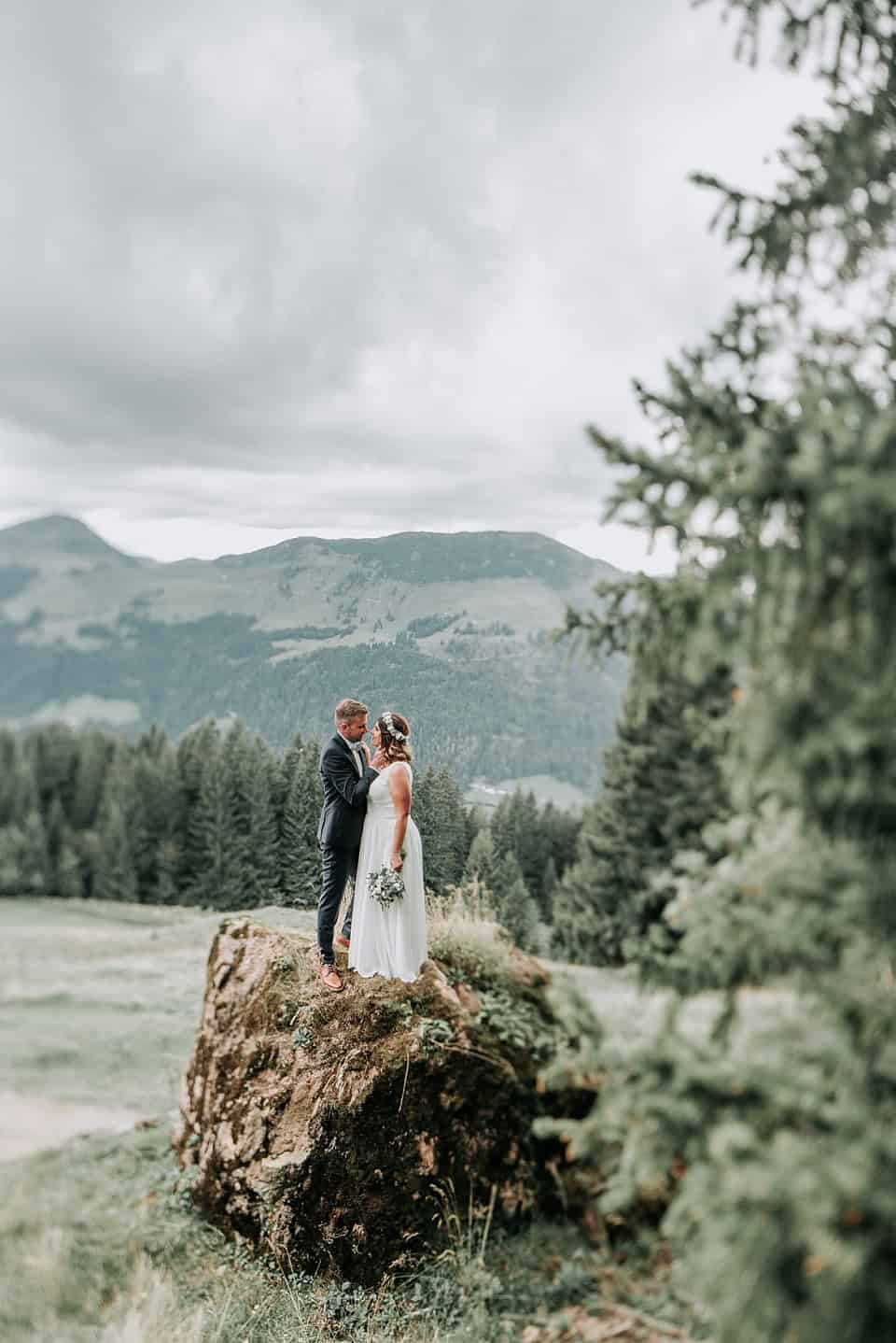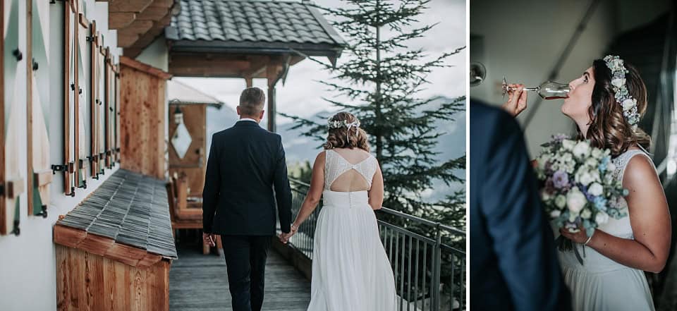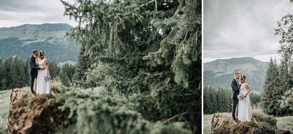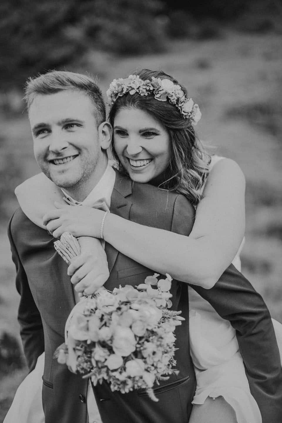 Nach der Trauung ging es für das Brautpaar Shooting hoch hinaus. Auf einem Plateau in der nähe eines alten Heustadels entstanden zahlreiche, emotionale Bilder, die für immer an die Berghochzeit erinnern sollen. Die beiden strahlten um die Wette und auch die geliebten Bergschuhe durften auf den Bildern natürlich nicht fehlen!