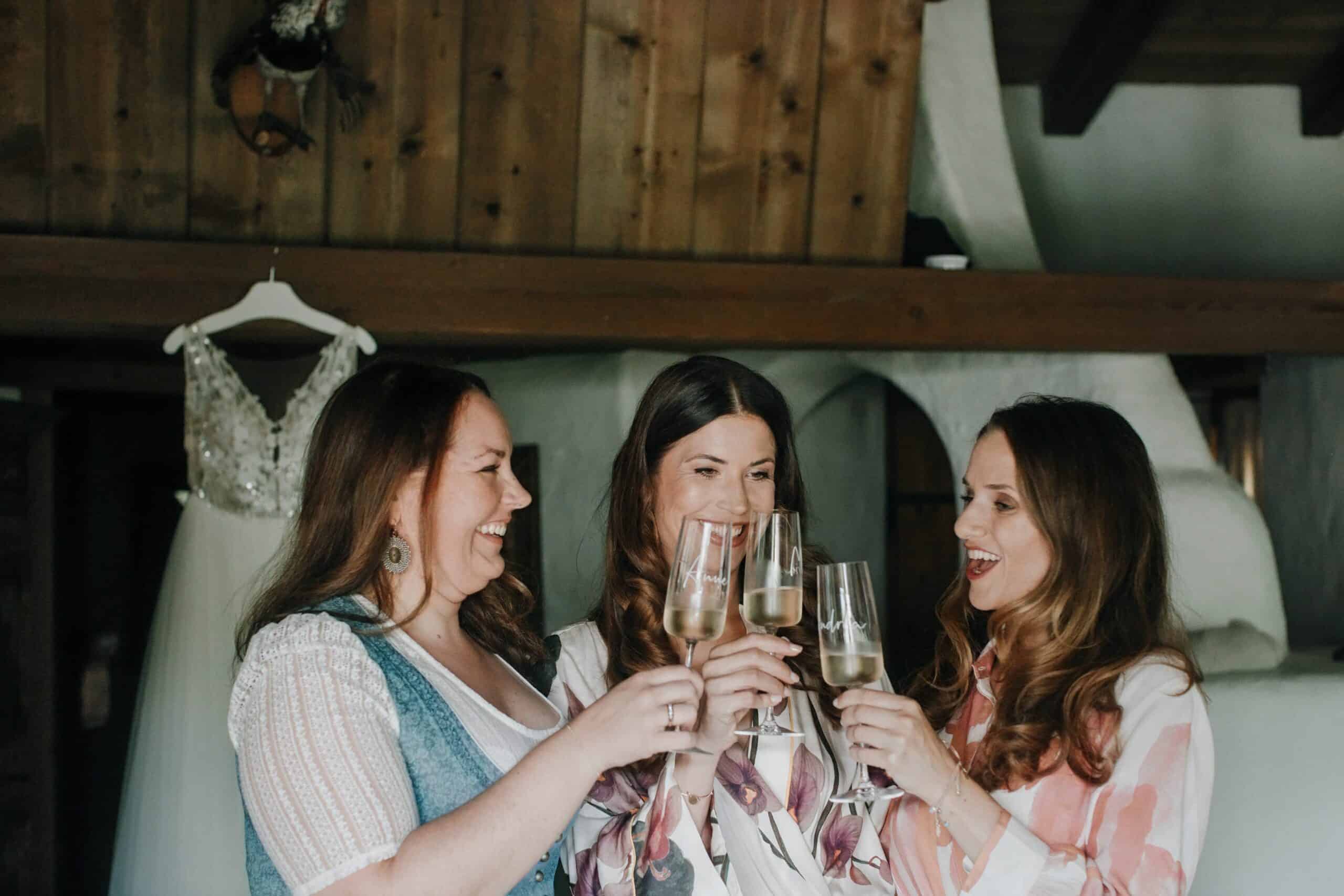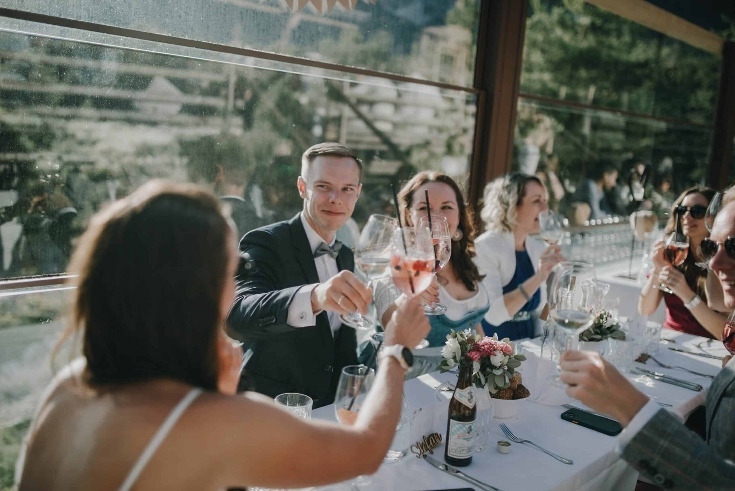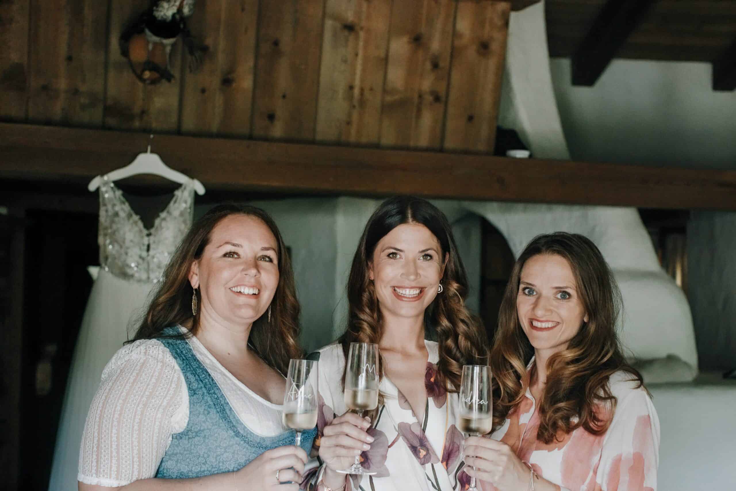 Im Anschluss an die standesamtliche Trauung stieß das Brautpaar bei herrlichem Sommerwetter mit Freunden und Familie auf ihren Tag, die Hochzeit auf der Stöttlalm, an.