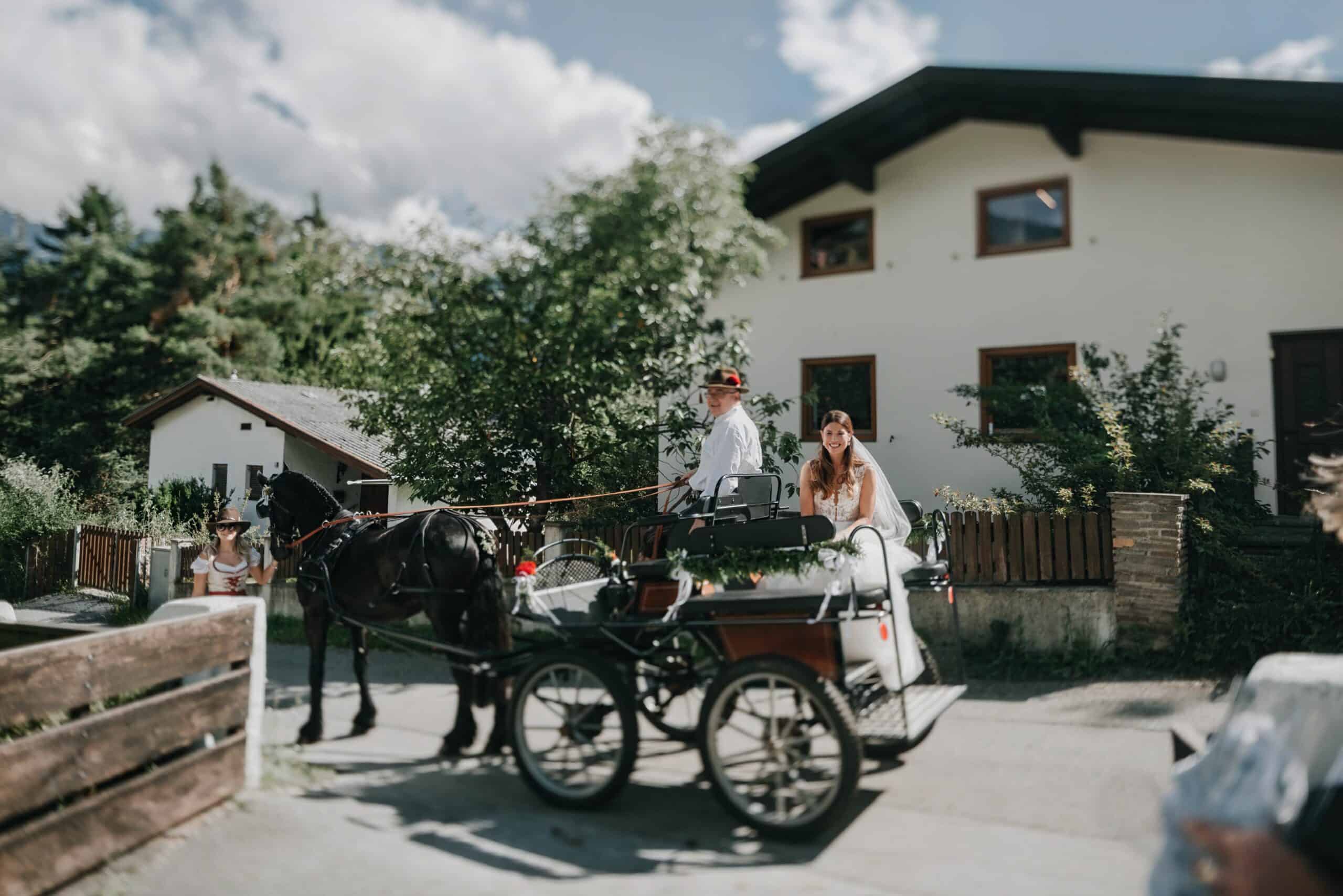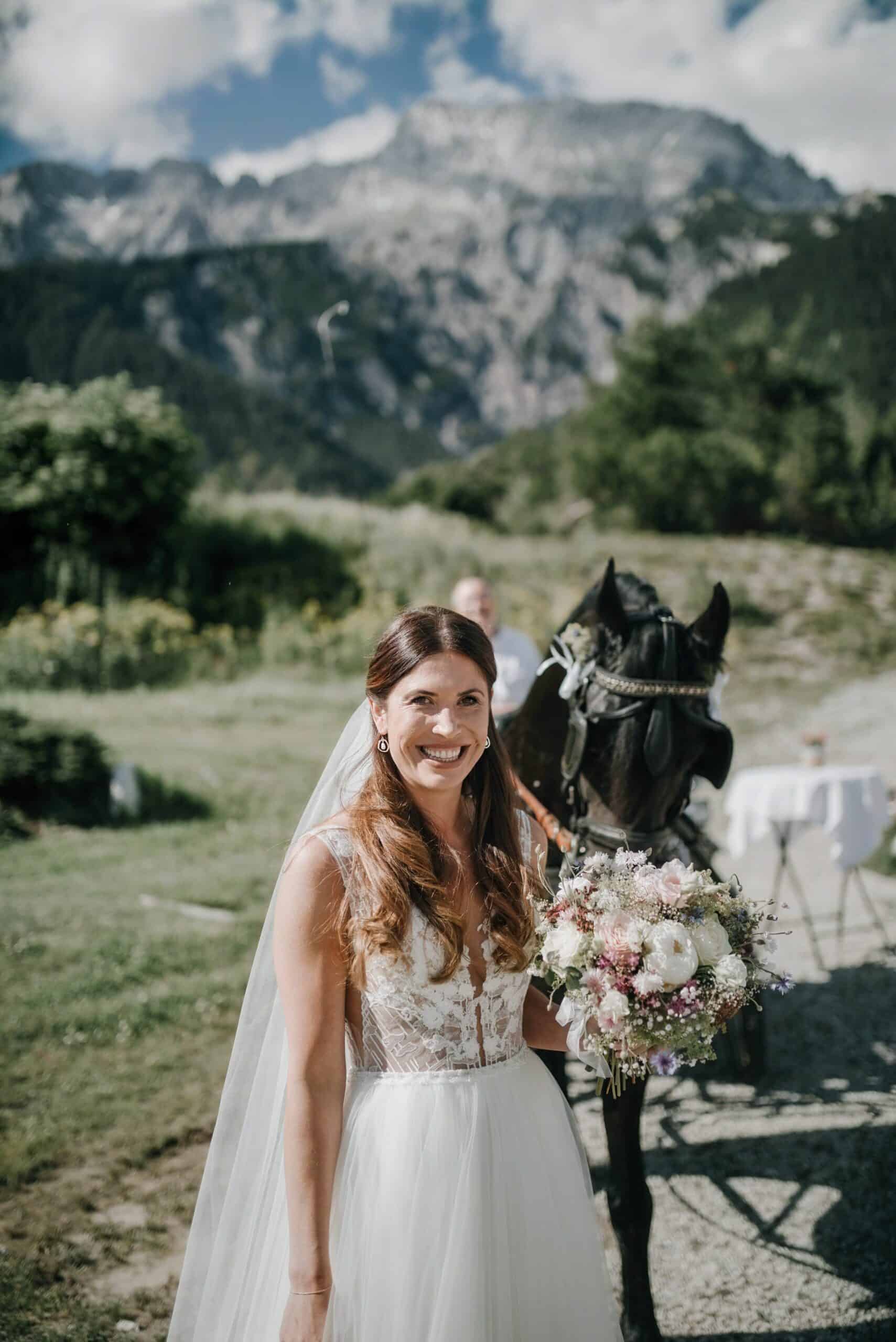 Im Anschluss fuhr Justin mit den Gästen in einem Taxishuttle zur Hochzeit auf der Stöttlalm. Für Mirja ging es standesgemäß in einer Kutsche dorthin.
