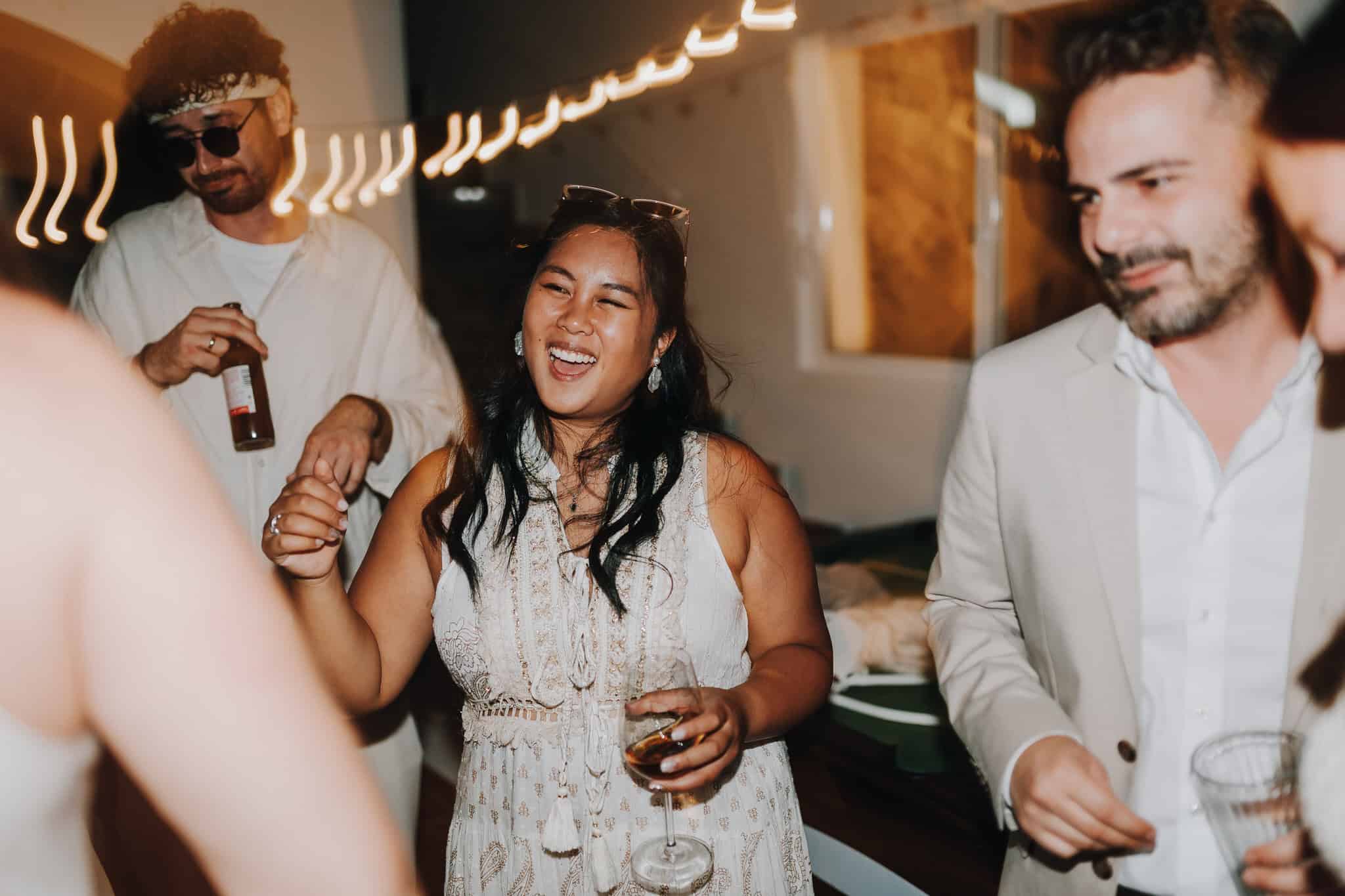 Nach der Zeremonie kehrten alle in die Villa zurück. Danach wurde gelacht, getanzt und gefeiert. Die Sonne wärmte die Terrasse, während die Gäste zusammenkamen.