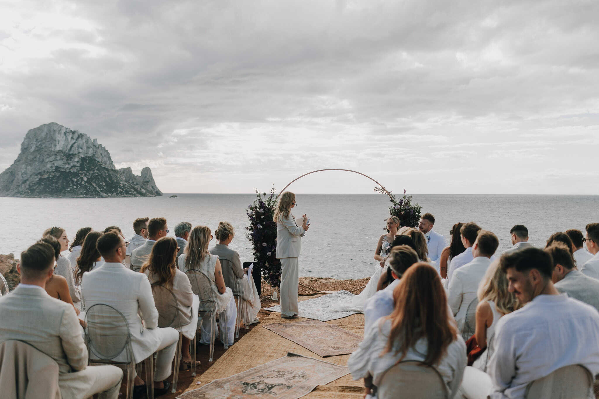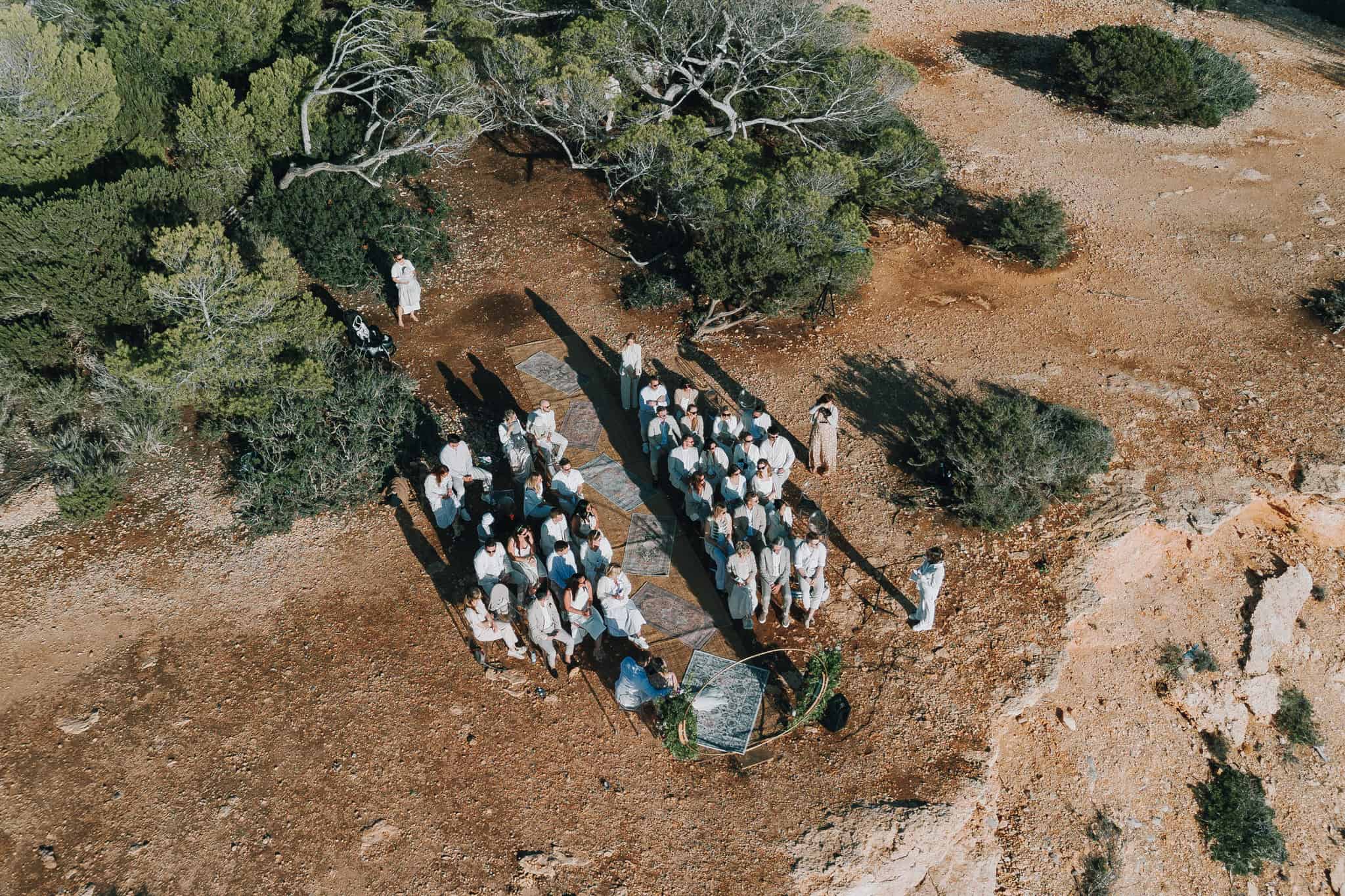 Die Trauung fand direkt auf einer Klippe statt. Dort, nahe der Bucht Cala Truja, öffnet sich der Blick weit über das Meer. Außerdem liegt der Ort nur wenige Schritte vom Restaurant Es Boldado entfernt.