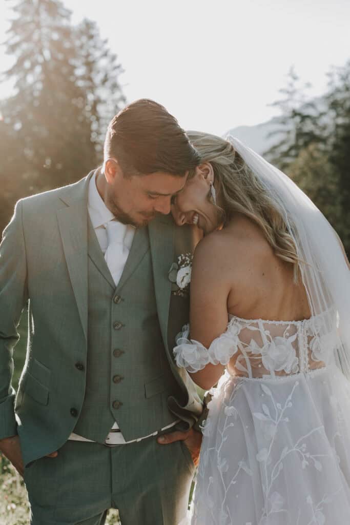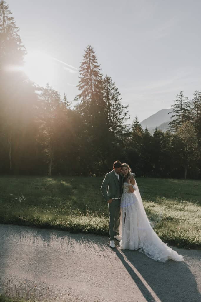 Als die Sonne langsam tiefer sank, durften wir mit Lexi & Tom hinaus auf die Almwiesen – und das Licht war einfach magisch. Das Abendlicht war perfekt – genau jene Momente, die unsere Arbeit als Hochzeitsfotograf in Leogang so besonders machen.