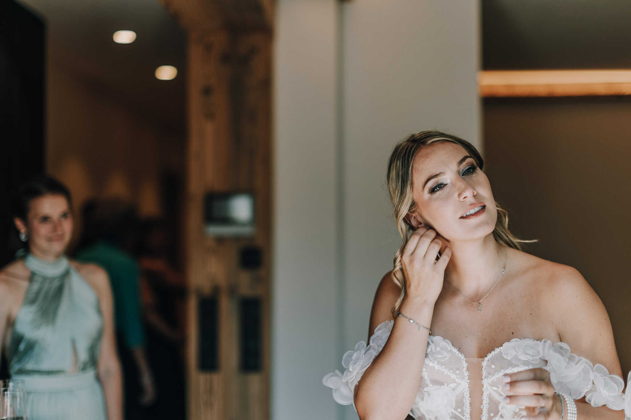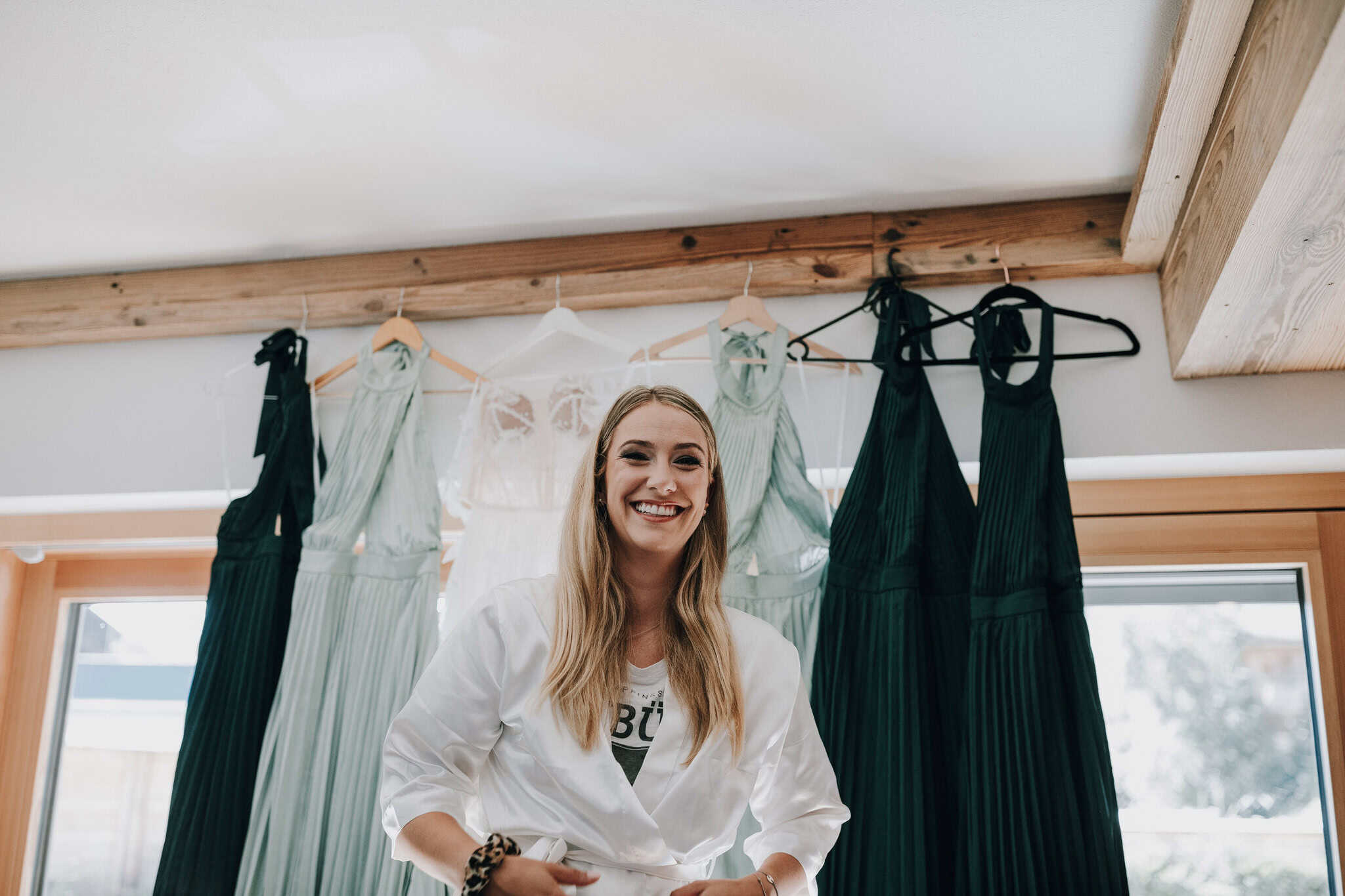Brautjungfer in Robe vor Kleidern, Hochzeit Kraller Alm. Hochzeitsfotograf Leogang.