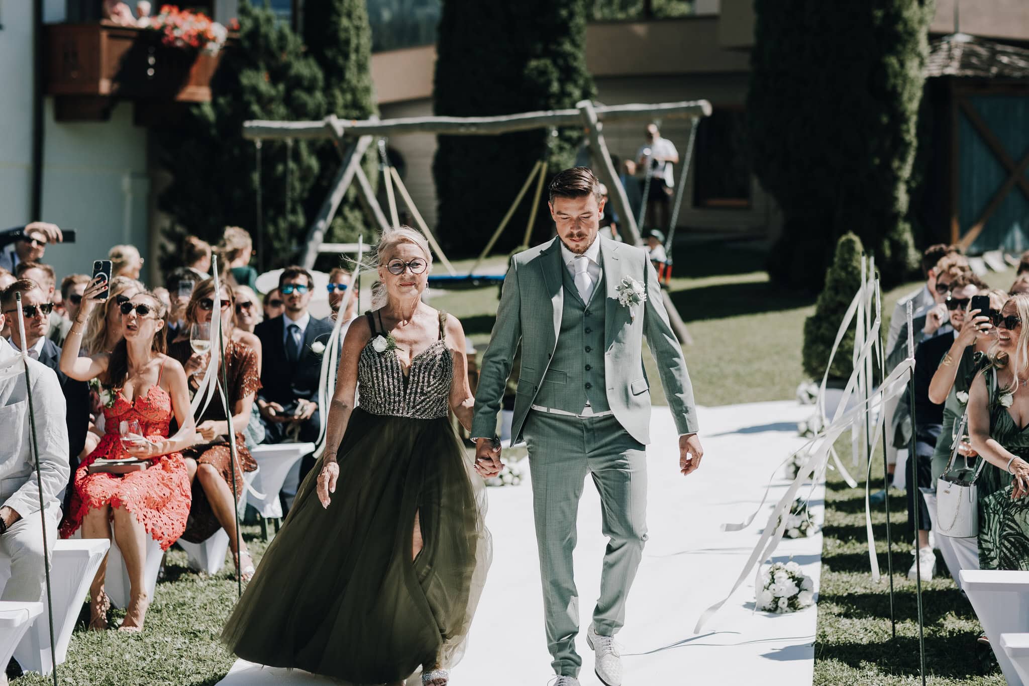 Zwischen den weichen Hügeln von Leogang, mit Blick auf die beeindruckenden Berge, fand die freie Trauung statt. Lexi & Tom hielten ihre Hände, lachten, weinten – und sagten Ja zueinander, während die Sonne ihre Gesichter golden küsste.