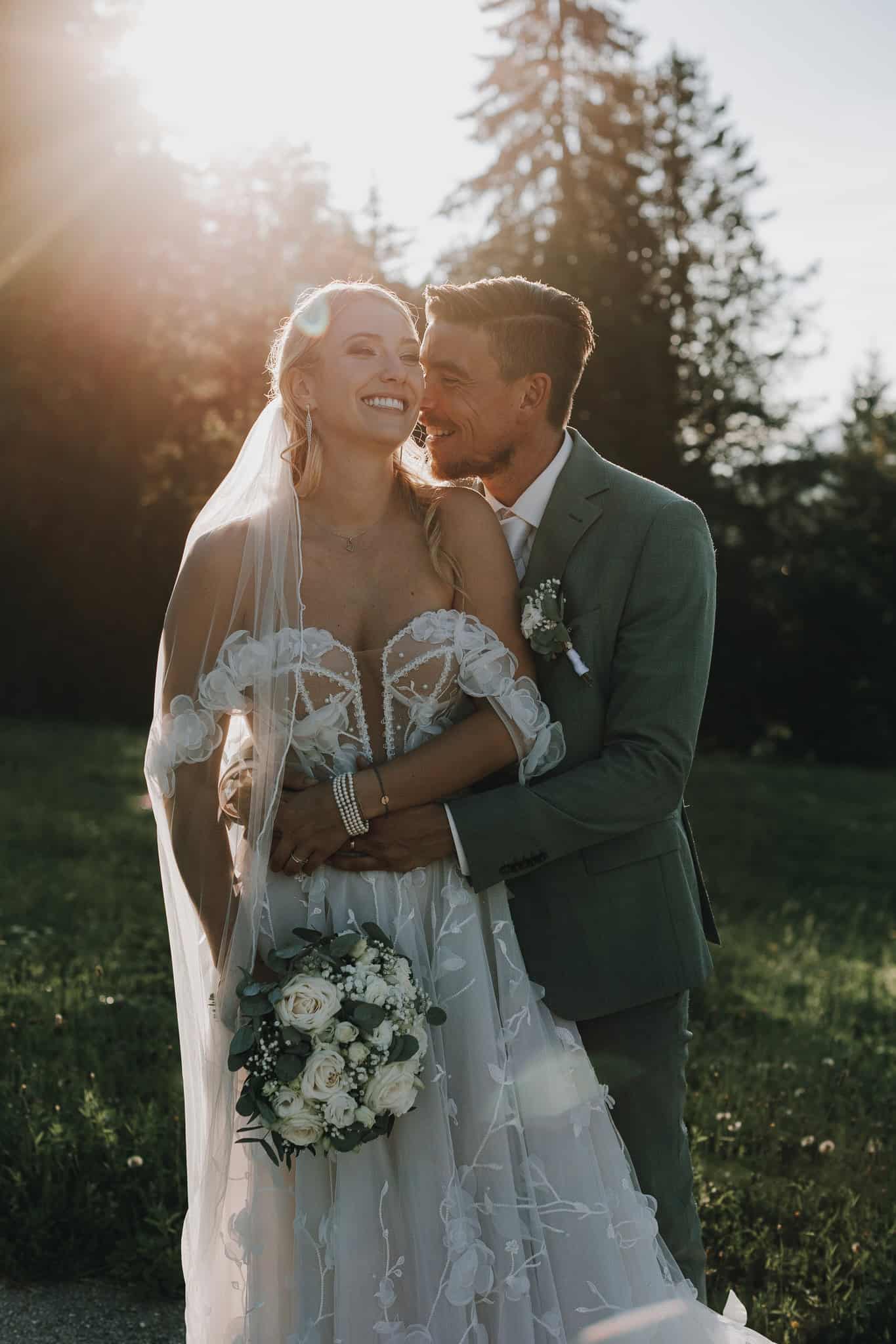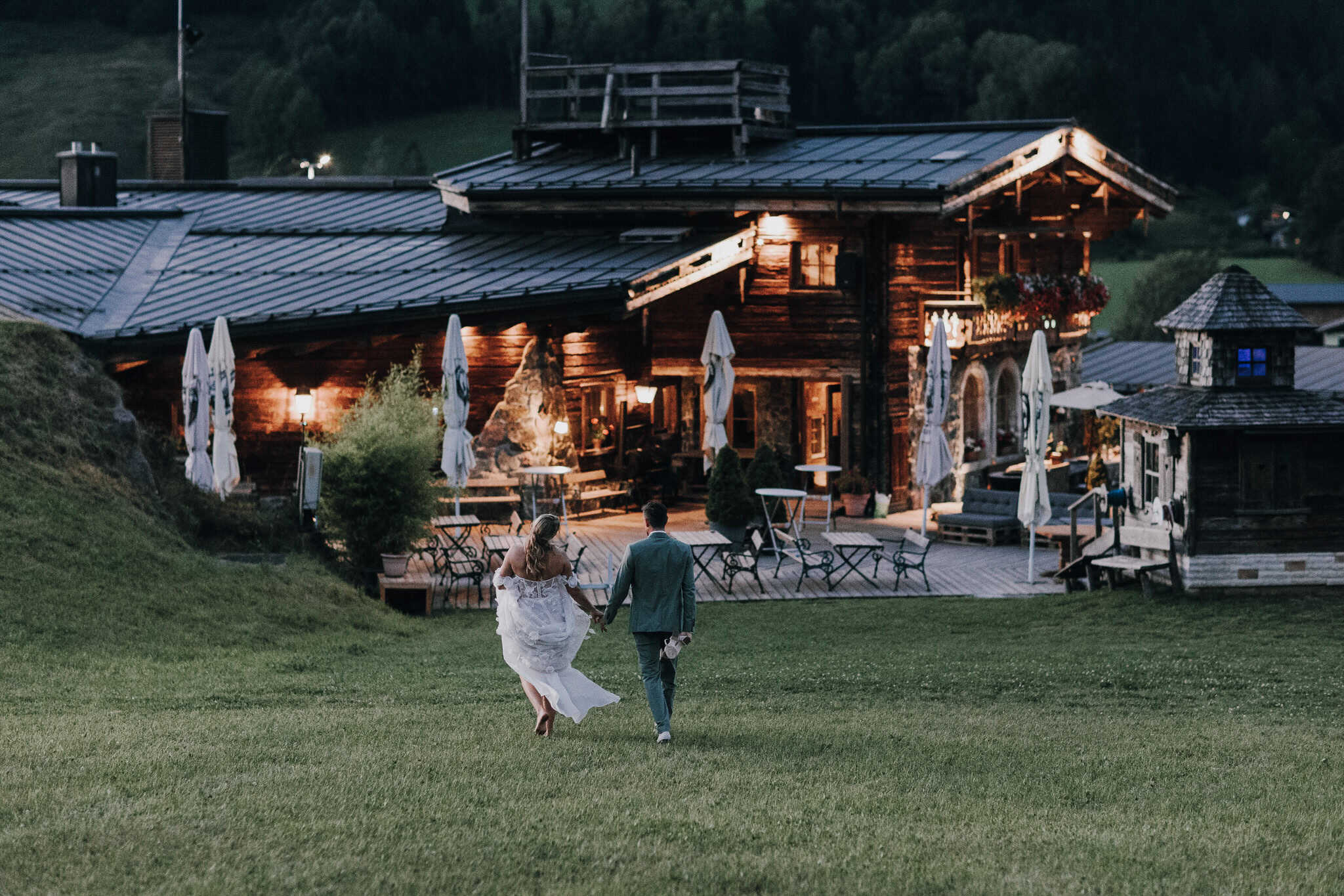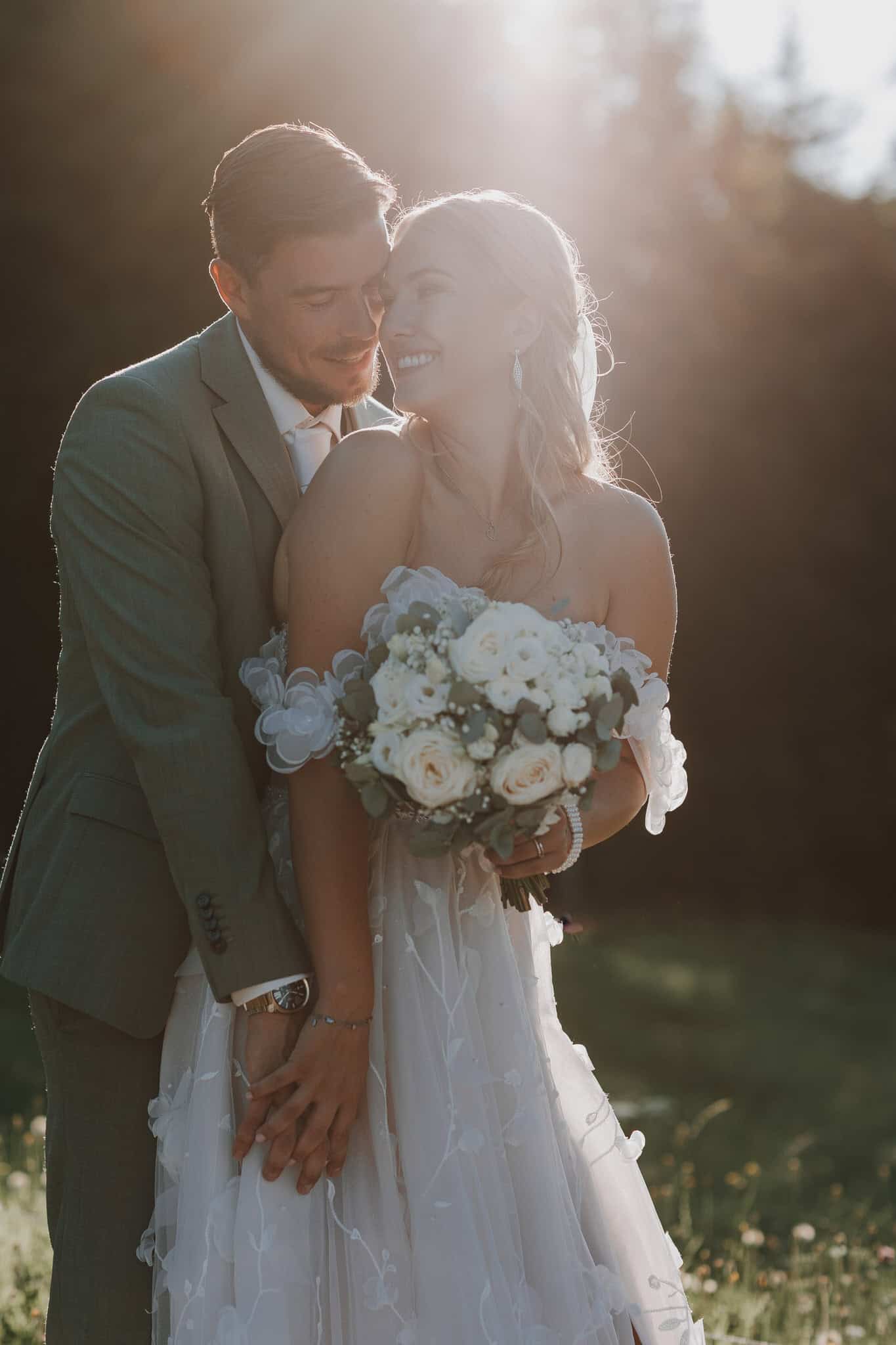 Als die Sonne langsam tiefer sank, durften wir mit Lexi & Tom hinaus auf die Almwiesen – und das Licht war einfach magisch. Das Abendlicht war perfekt – genau jene Momente, die unsere Arbeit als Hochzeitsfotograf in Leogang so besonders machen.