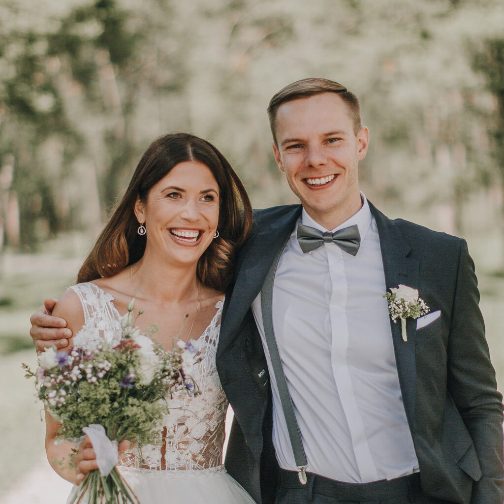 Glückliches Brautpaar im Freien. Braut hält Blumenstrauß, Bräutigam im Anzug. Hochzeitsfotograf Tirol.