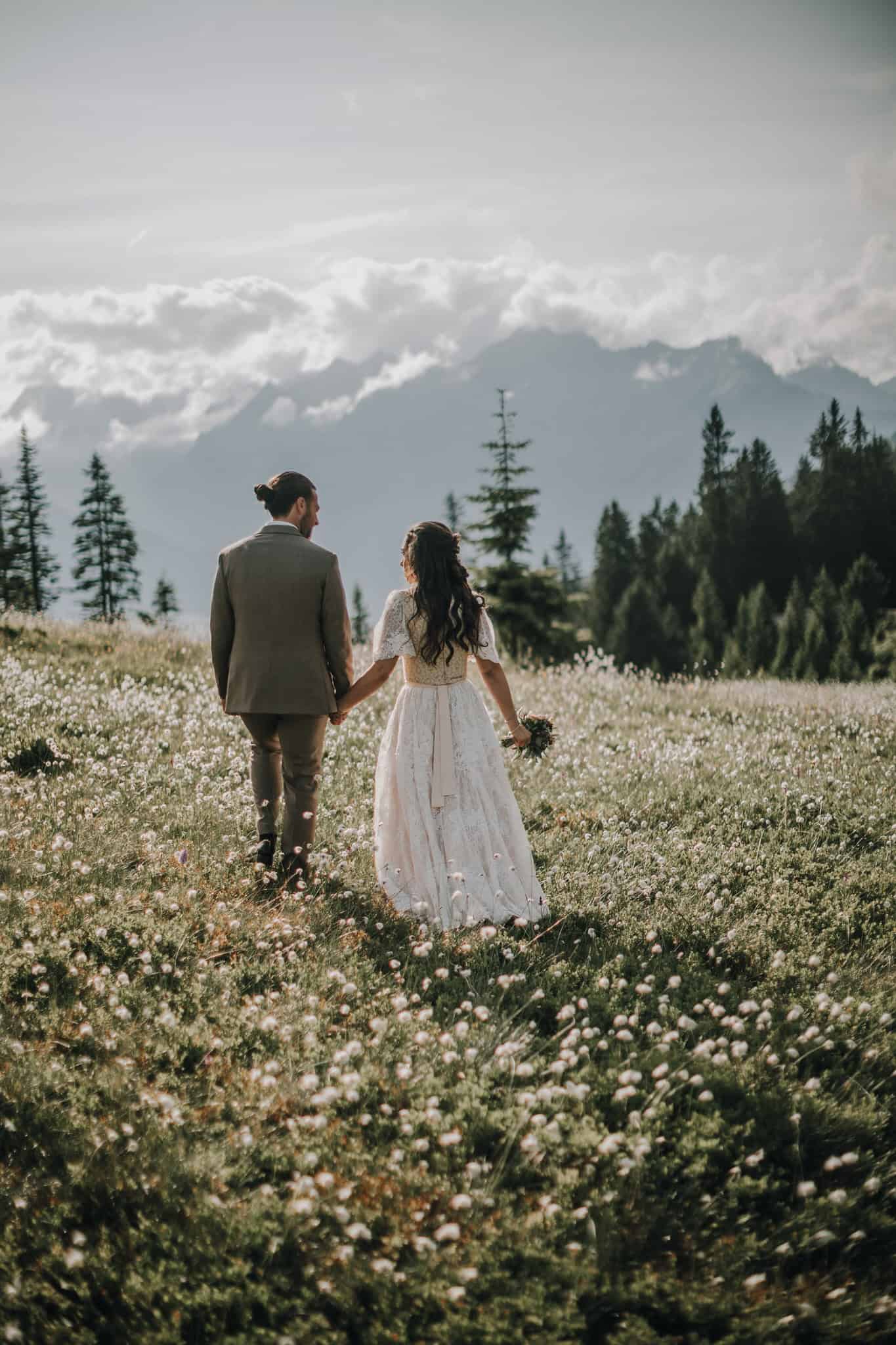 Brautpaar hält Händchen in den Tiroler Alpen. Hochzeit im Freien mit Blick auf die Berge.