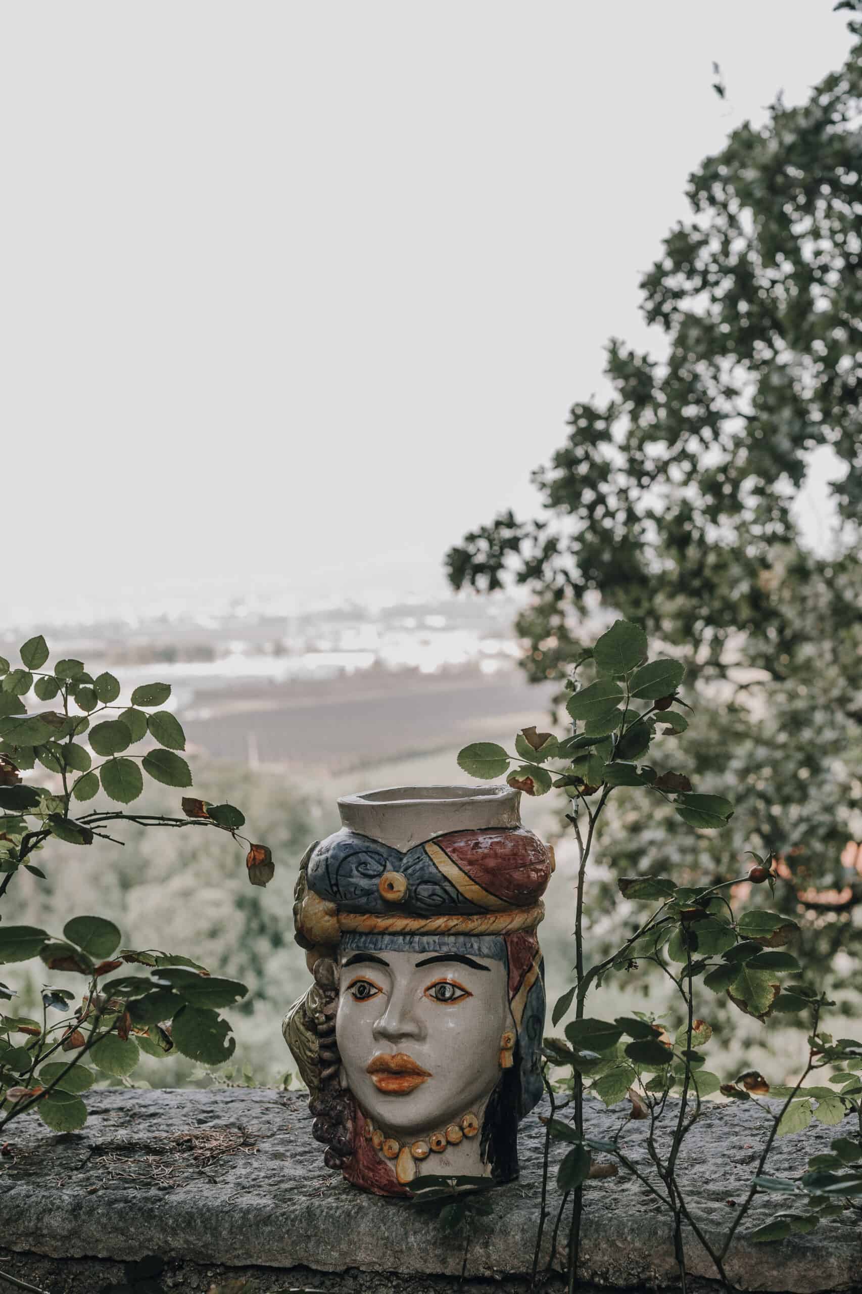 002 – 13-09-23 HZ Nadine und Dominik – L Detailaufnahme einer kunstvollen Keramikvase in Form einer Frau mit buntem Dekor, geeignet für elegante Hochzeitsfotografie.