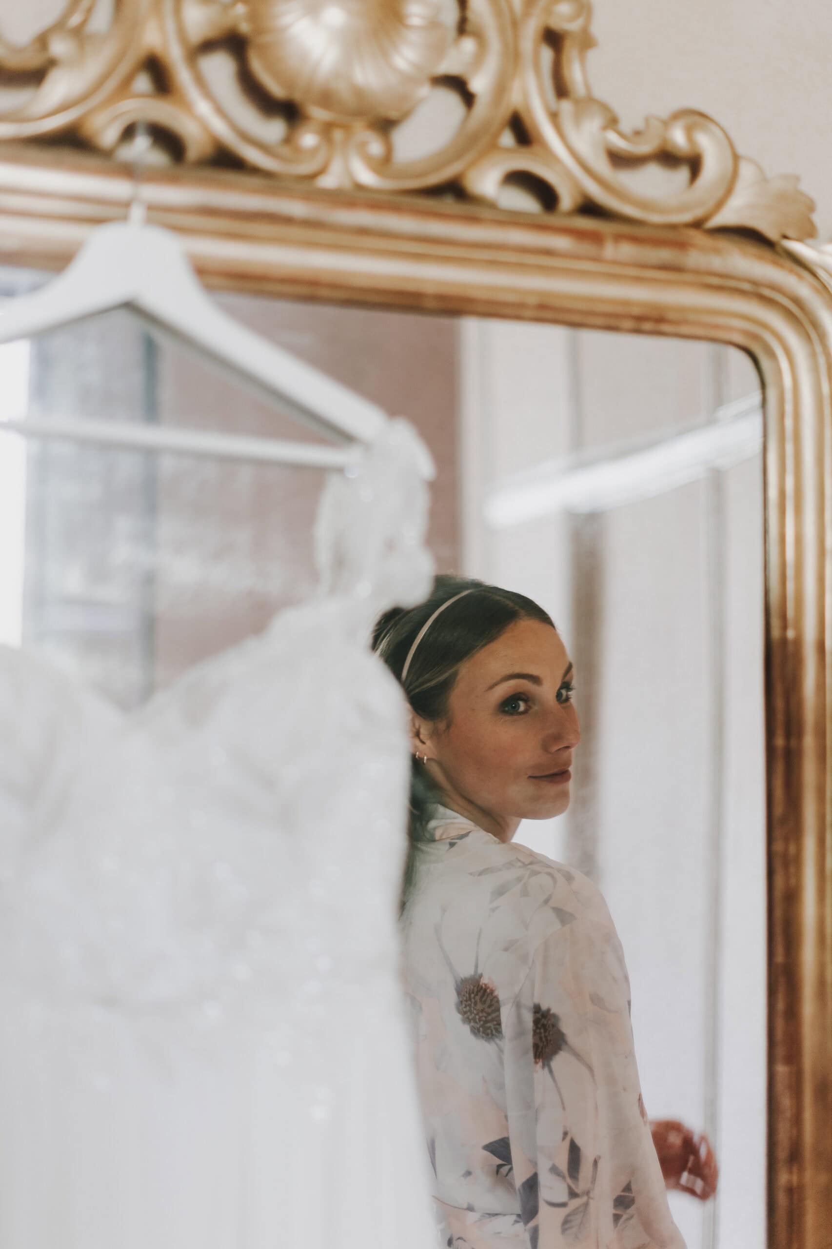 087 – 13-09-23 HZ Nadine und Dominik – L Detailaufnahme einer Braut, die ihr Hochzeitskleid im Spiegel bewundert, bei Hochzeitsfotografie in Tirol.