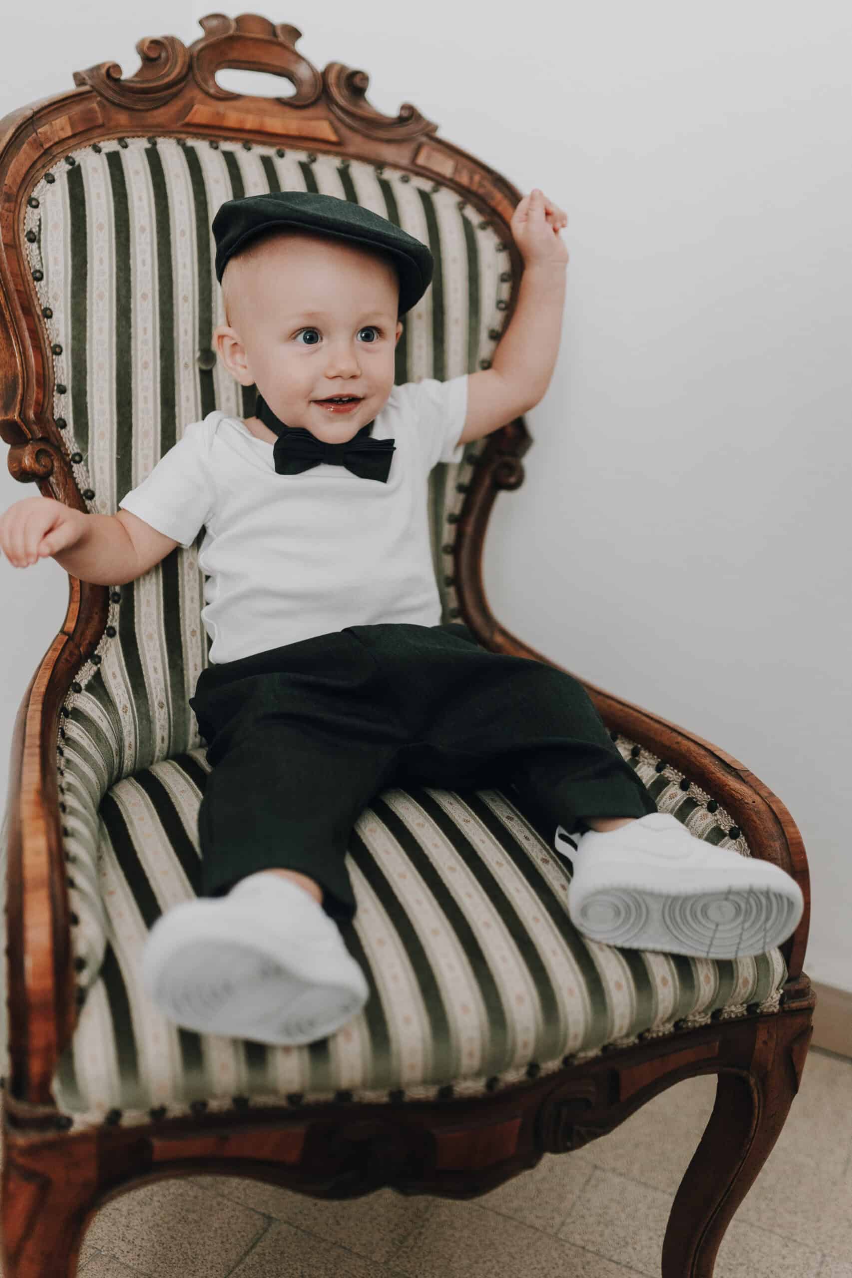 115 – 13-09-23 HZ Nadine und Dominik – L Ein kleiner Junge in formeller Kleidung sitzt auf einem antiken Sessel und freut sich bei einem besonderen Anlass in Tirol.