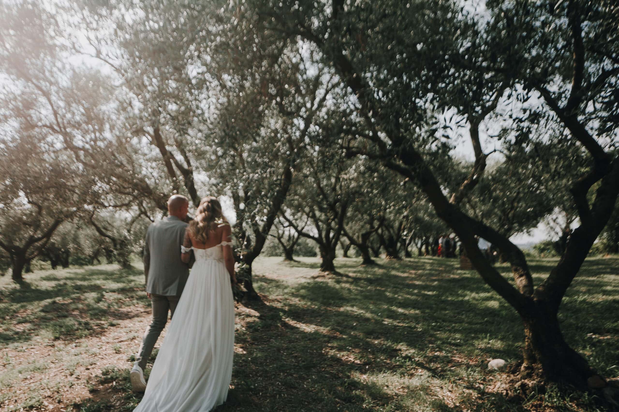 191 – 13-09-23 HZ Nadine und Dominik – L Detailreiche Hochzeitsaufnahme eines Brautpaares beim Spaziergang im Apfelhain, Tirol, Österreich, bei Sonnenuntergang.